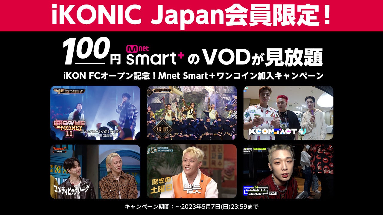 2015年に開催したサバイバル番組から誕生した6人組ボーイズグループiKON。4月11日には日本公式ファンクラブ「iKONIC Japan」が新たにオープンし、5月の「KCON JAPAN 2023」への出演や、5月から9月にかけて台湾やフィリピン、フランス、スペイン、タイ、シンガポール、アメリカなどを巡るワールドツアー『iKON WORLD TOUR [TAKE OFF] TOKYO』も精力的に敢行します。グローバルアーティストとしての地位も確立し、ますます進化と輝きが止まらないiKONのファンクラブのオープンを記念して、本日12:00より<iKON FCオープン記念!Mnet Smart+100円加入キャンペーン>の実施が決定!ファンクラブ会員限定で、通常月額990円(税込)のMnet Smart+ライトプランをなんと月額100円(税込)でご提供します。このチャンスを絶対にお見逃しなく‼