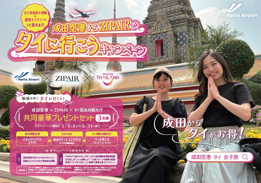 成田国際空港、ZIPAIR、タイ国政府観光庁の3者共同による豪華プレゼントが当たる「ZIPAIRでタイに行こうキャンペーン」を開催中。