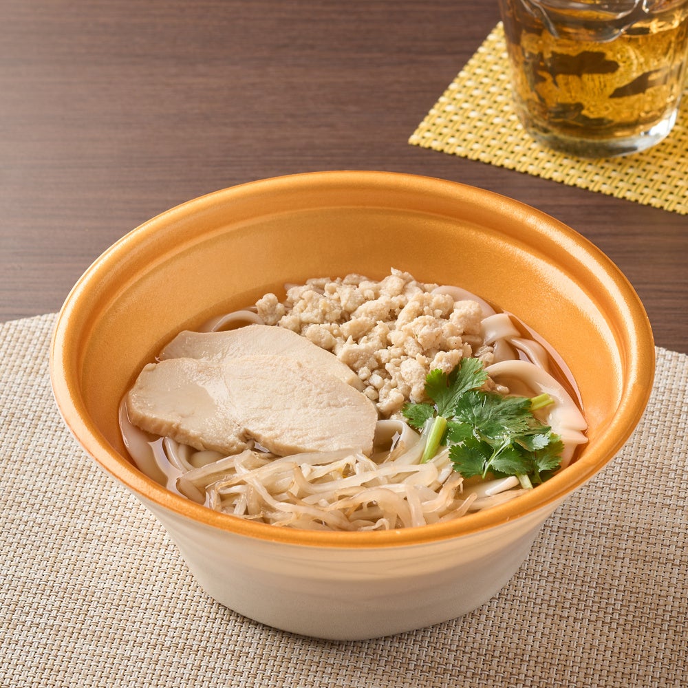 特長:タイの屋台でもよく食べられている、あっさりとした味わいの「センレック ナーム」をイメージし、もちもちした食感とつるりとしたのど越しの自家製の米粉麺に、ナンプラーを加えた鶏がらベースのスープを合わせた本格的な味わいです。蒸し鶏、鶏のミンチ、パクチー、もやしをトッピングしました。
