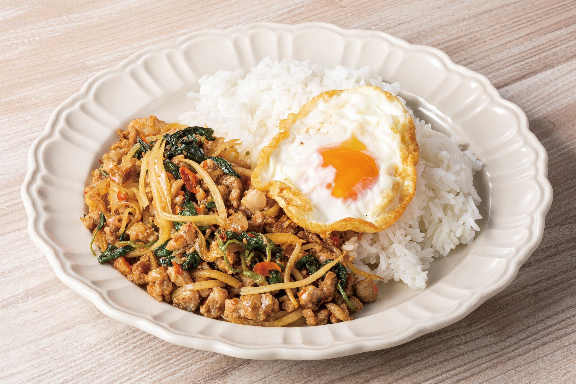 “ガパオ”とは、爽快な香りのタイバジルのことで、タイでは挽き肉に限らず、肉やシーフード、野菜などをたっぷりの“ガパオ”、唐辛子、にんにく、ナンプラー、シーズニングソース(タイの調味料)、オイスターソースなどと炒めた「ガパオ炒め」が屋台の定番メニューです。