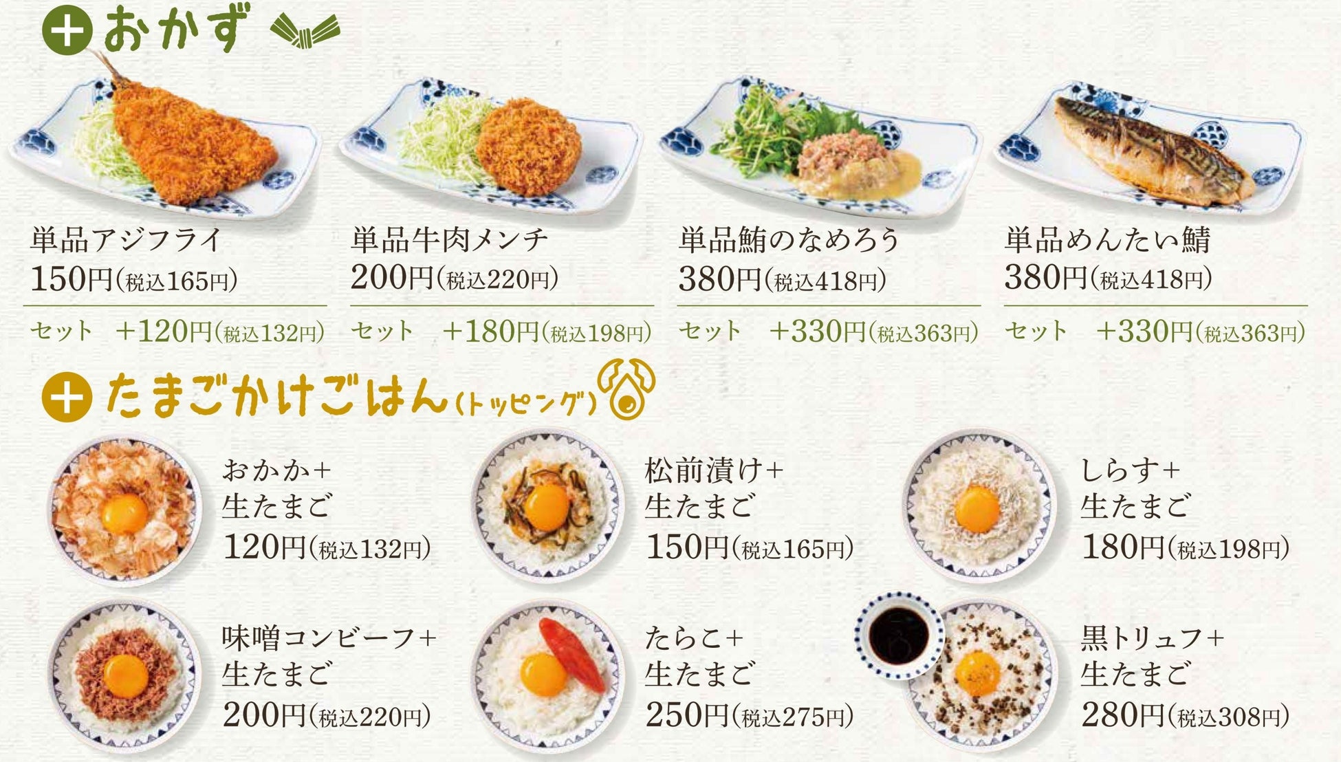 お茶碗を彩る”たまごかけごはんトッピング”は、外食だからその時の気分で選べる定番から個性派の6種類をご用意いたしました。