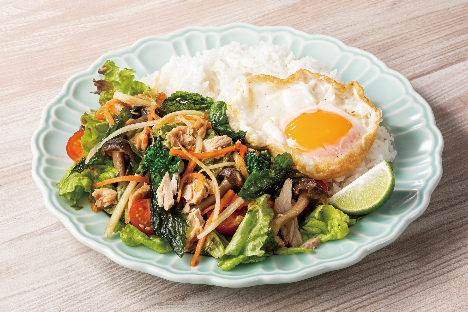 葉野菜やブロッコリー、トマト、きのこ、グリーンパパイヤなどの野菜がたっぷりでツナ入りのガパオ。