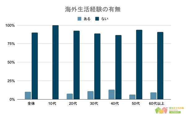 中でも40代の人は13.2%と他の世代よりも多くの人が、海外で生活していることがわかります。一方、10代で経験のある人は0%、20代の人も7%となっており、20代以下の人では海外生活の経験が少ないことがわかりました。