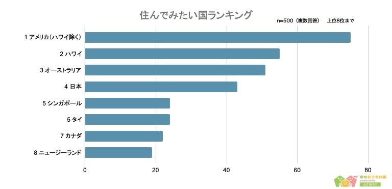最後に、「一番住んでみたい国」について聞いたところ、1位が「アメリカ(75人)」、2位が「ハワイ(55人)」、3位が「オーストラリア(51人)」という結果になりました。また、日本を除くアジア圏では「シンガポール(24人)」、「タイ(24人)」、「台湾(14人)」が上位になっています。