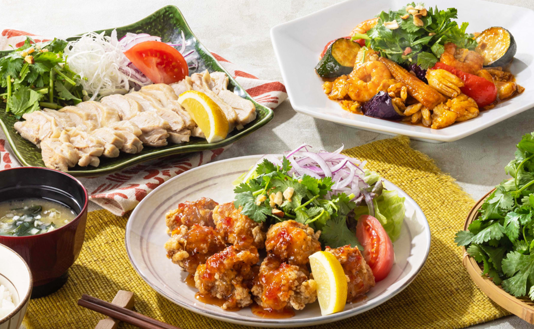 スイートチリのアジアン唐揚げ定食、鶏もも肉の大戸屋風カオマンガイ定食、夏野菜と海鮮のトムヤム玉子炒め定食。期間限定『アジアン食堂』2023年6月16日(金)より。