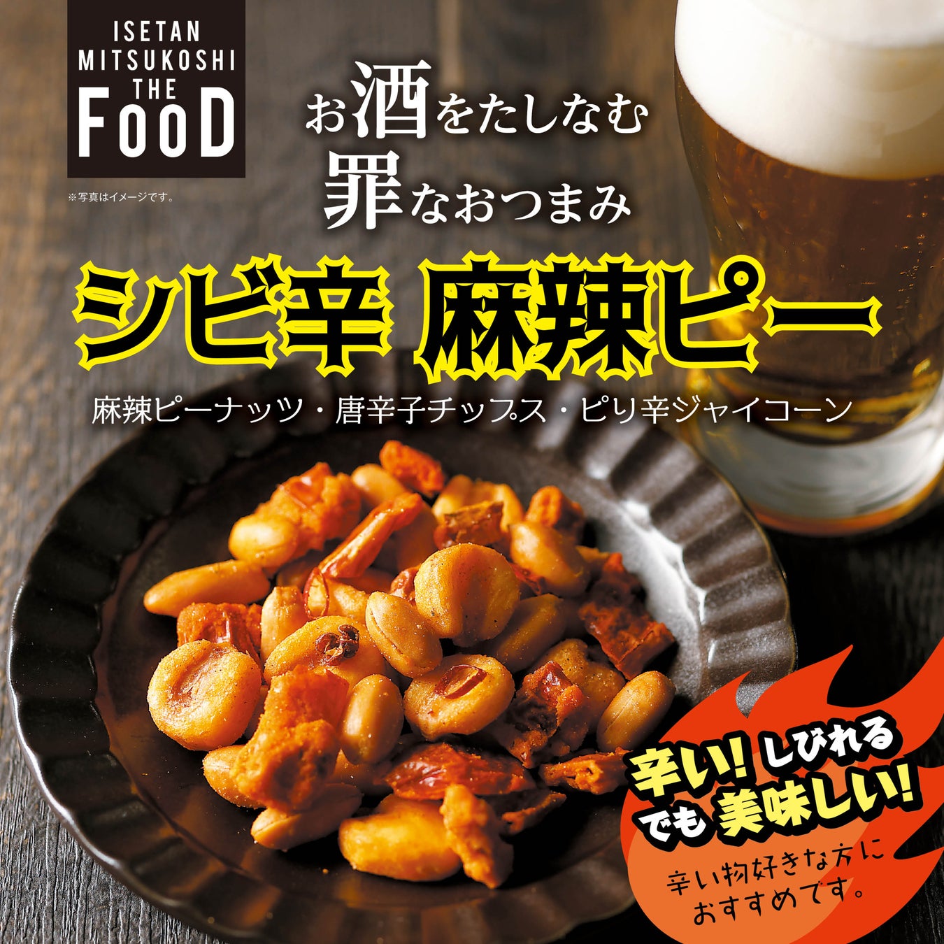 「シビ辛麻辣ピー」は麻辣ピーナッツ、唐辛子チップス、ピリ辛ジャイアントコーンの3種類を合わせた、お酒と相性ぴったりの罪なおつまみです。唐辛子だけでなく麻辣も加えることで痺れる辛さもプラスし、辛いだけでは満足できない人も楽しんでいただける《シビ辛》な味わいに仕上げました。