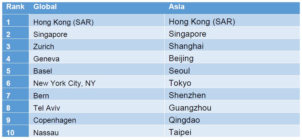 スイスのチューリッヒ(3位)、ジュネーブ(4位)、バーゼル(5位)、ベルン(7位)の4都市と、米国のニューヨーク(6位)、イスラエルのテルアビブ(8位)、デンマークのコペンハーゲン(9位)、バハマのナッソー(10位)がトップ10入りした。