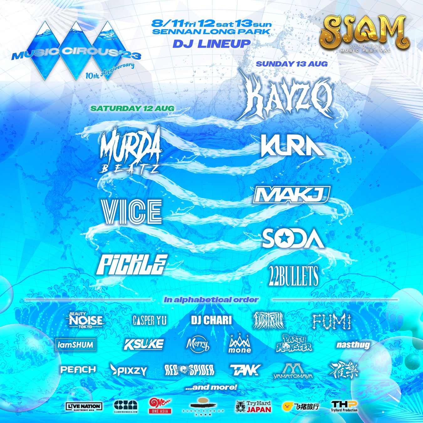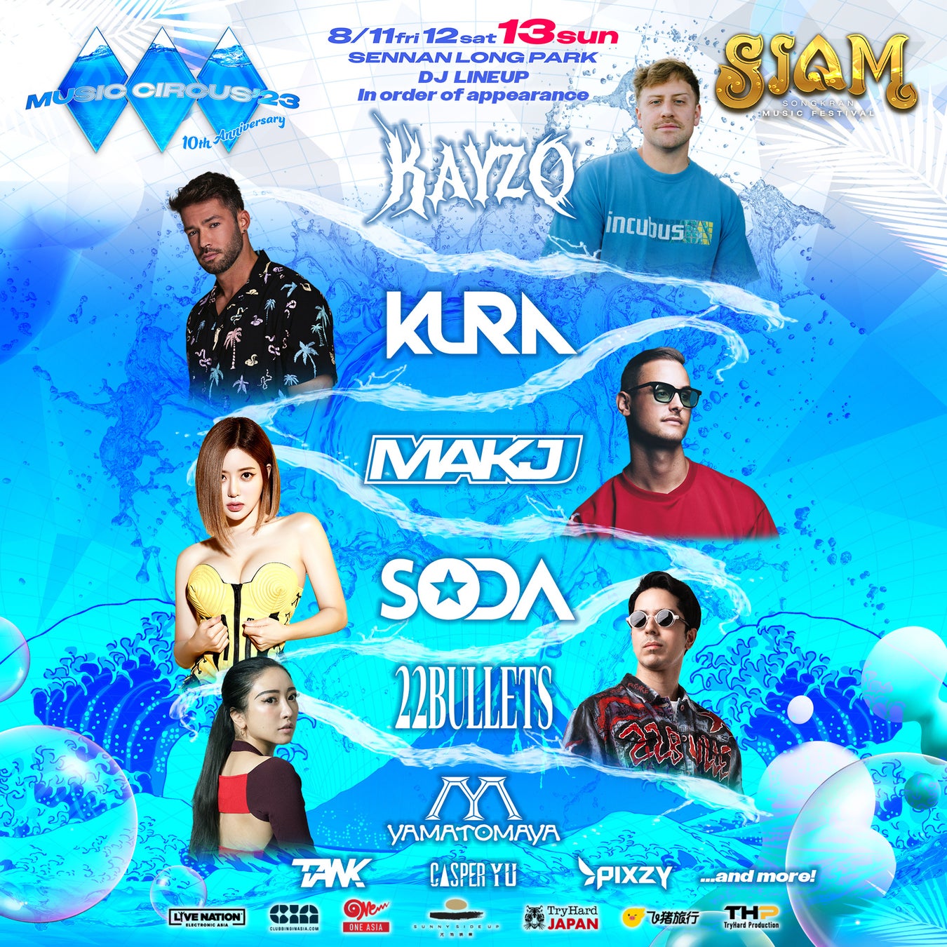 MUSIC CIRCUS10周年を記念して、「水かけ祭り」として有名な、タイ発アジア最大級音楽フェスティバル「SIAM Songkran Music Festival」とのコラボレーションが決定。タイを代表するDJ である22BULLETS、PIXZYの2名が来日します。放水銃から発射される大量の水しぶきを浴びて、ずぶ濡れで盛り上がろう!