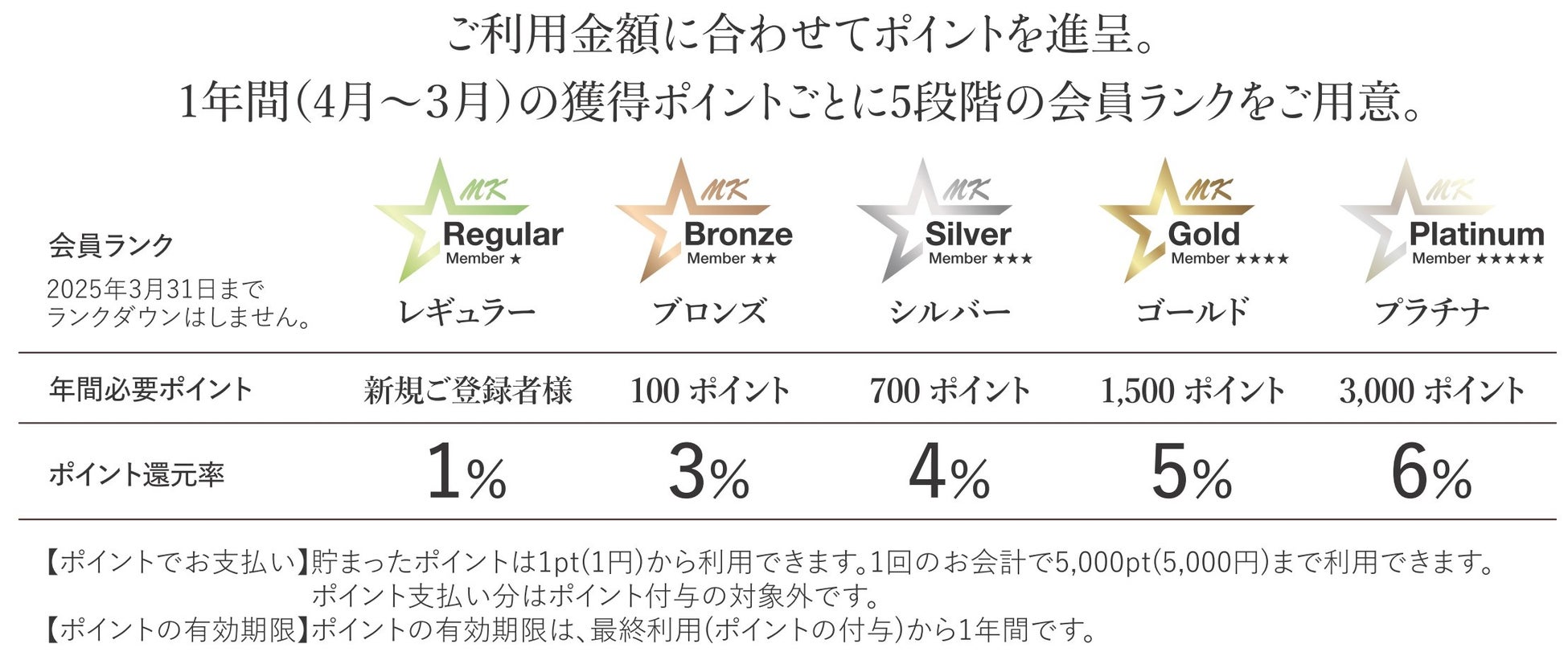 「MKレストラン」全店共通のポイントが貯まる機能を搭載。お会計の際に、ポイントが貯まります。ご利用状況に応じてポイント付与率がアップしますので、利用すればするほどお得に。