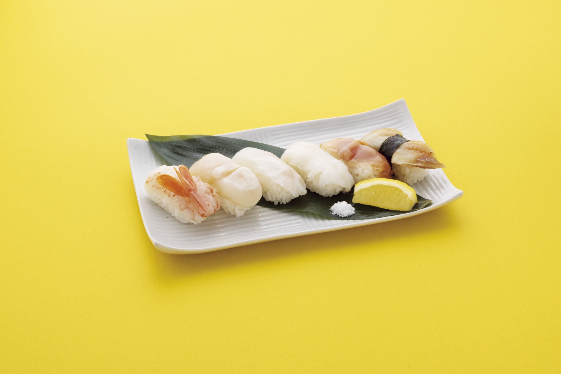 赤えび・ほたて・真鯛・いか・赤貝・穴子の6貫入り。塩とレモンであっさり食べたり、わさびと塩・醤油で