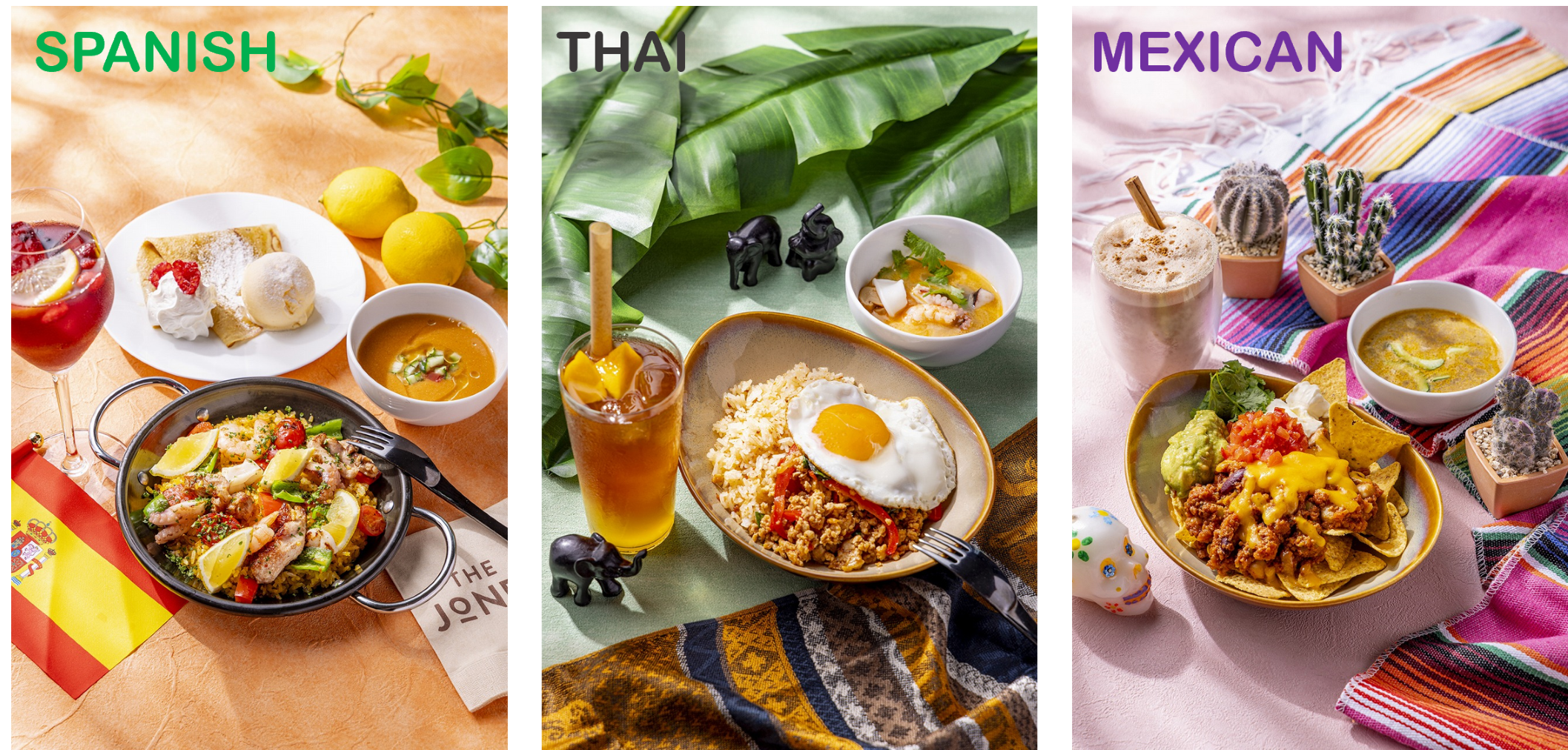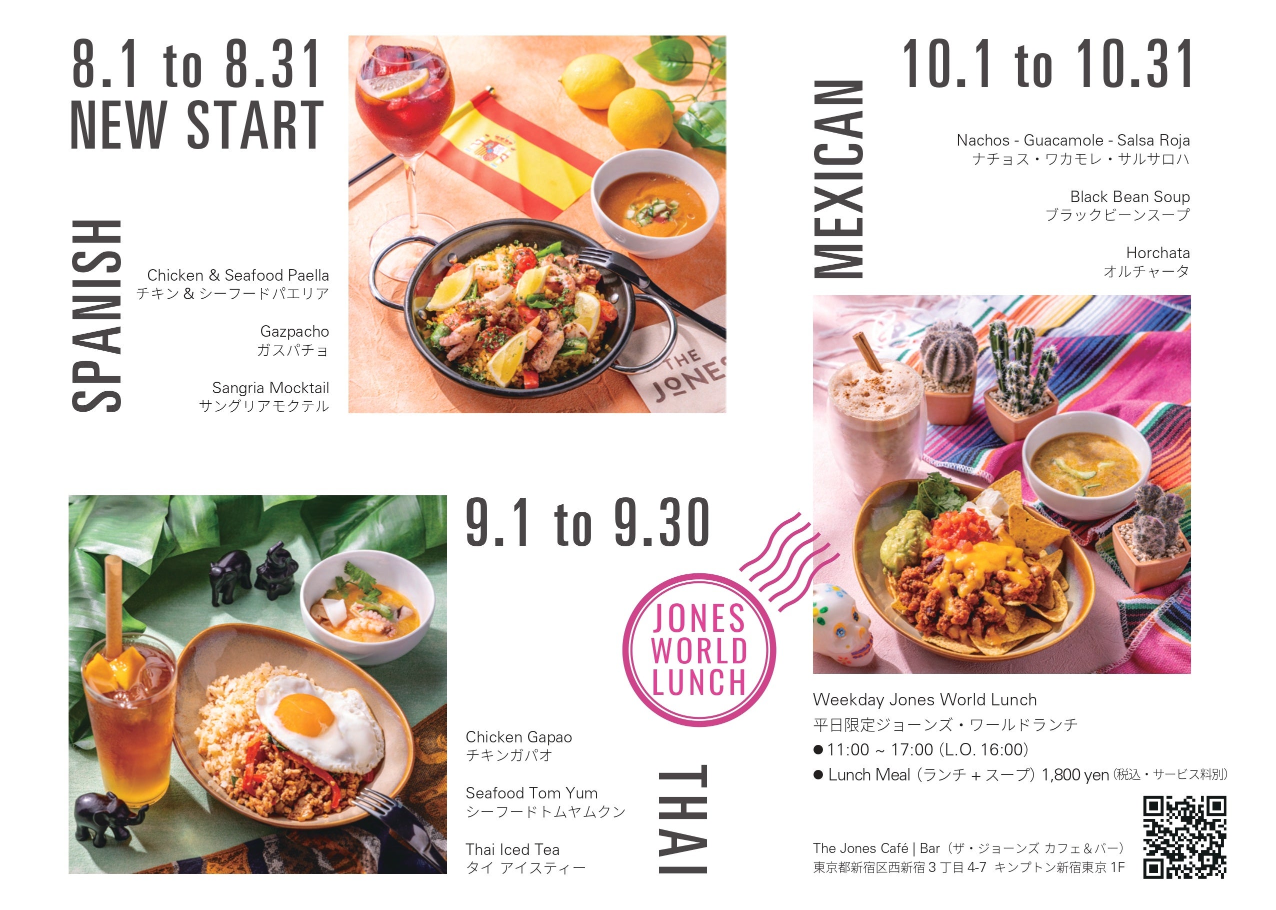 ザ・ジョーンズカフェ&バーでは、世界都市のアイコニックなグルメをランチタイムに気軽に愉しめる、平日限定のランチメニューを8月1日より販売開始します。8月のスタートはスペイン料理。メインにはチキン&シーフードのパエリア、スープはガスパチョ、ドリンク(セット別料金)はサングリアモクテル、デザート(セット別料金)はバニラアイスを添えたクレープ、と大満足の本格派メニューをお得なプライスでご用意。メイン・スープ・ドリンク・デザート全てをその月のテーマに合わせてご提供します。ご予約不要なのでお仕事中の気分転換にもふらっとお気軽にお越しください。