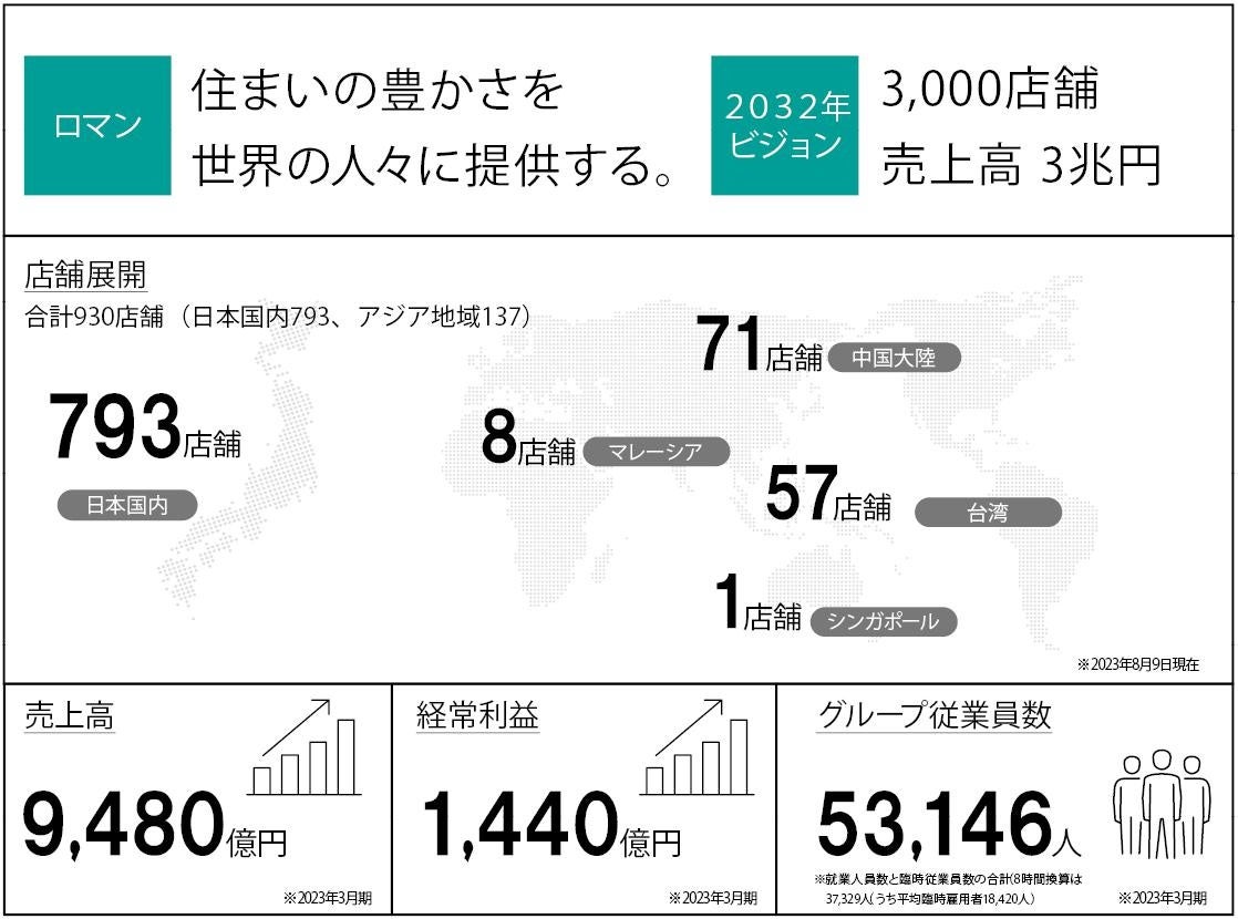 ニトリグループは、「住まいの豊かさを世界の⼈々に提供する。」というロマン(志)、2032年3,000店舗、売上⾼3兆円を達成するというビジョンを掲げています。