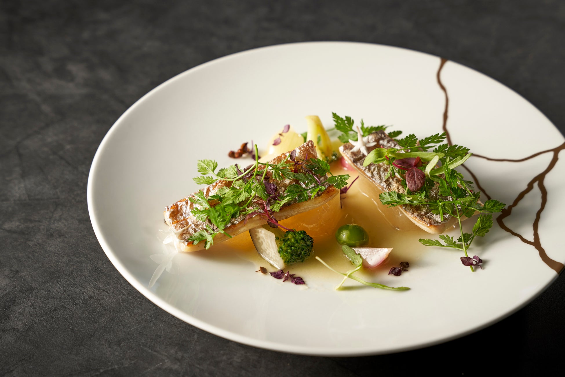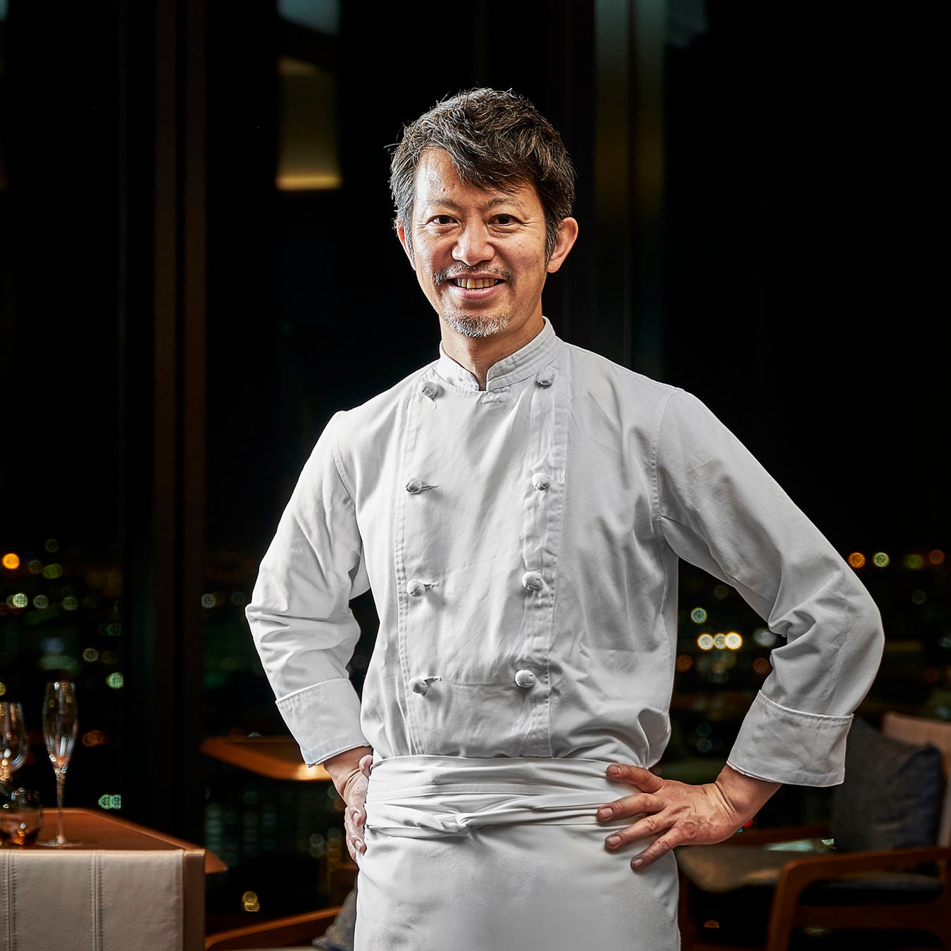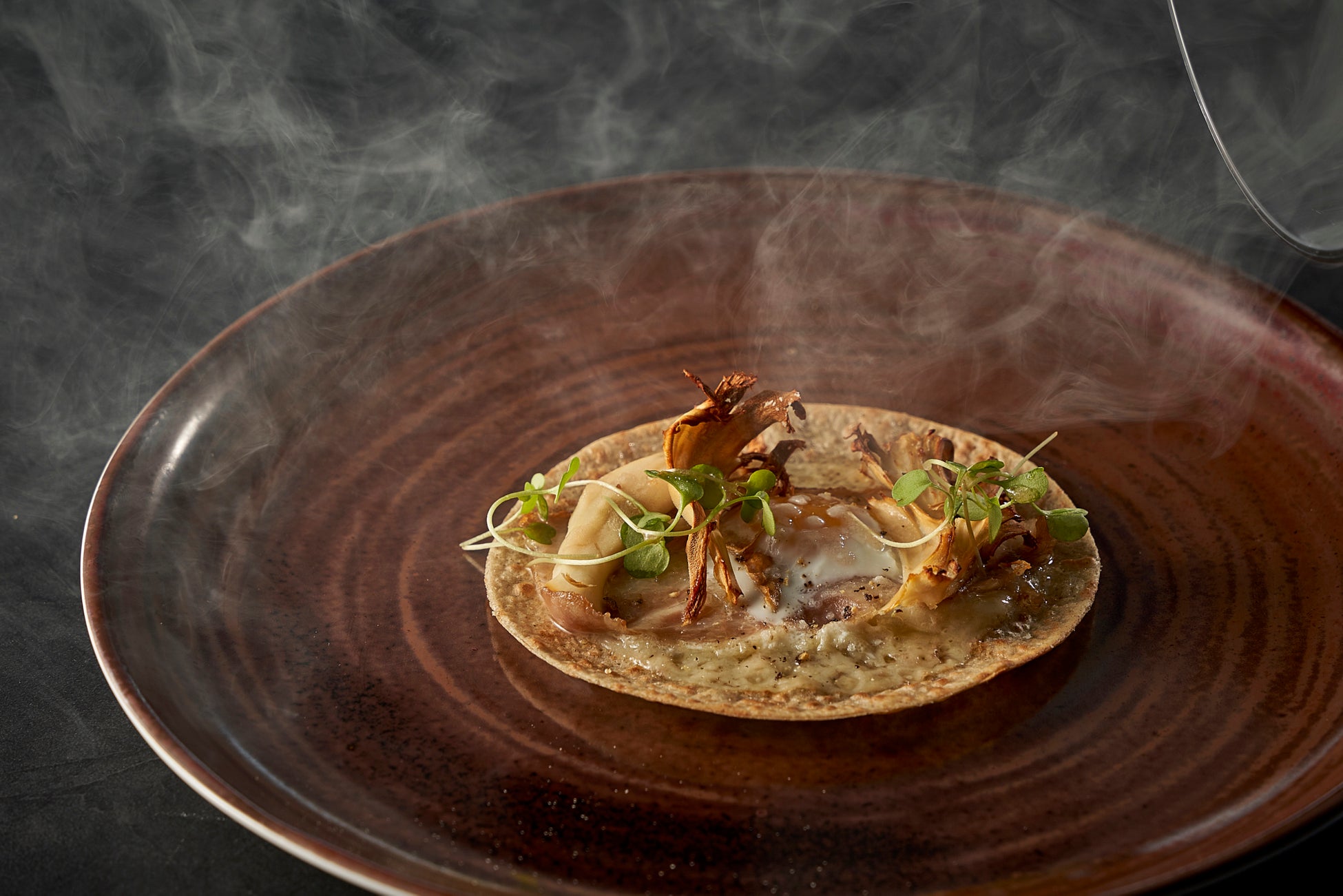 同じく33階に位置し、フレンチベースの料理を独自の燻製技術でアレンジした独創的なメニューを提供する「燻製キッチン」では、高層階のレストランすべてを統括するヘッドシェフ・浅野裕之が手掛ける旬の味覚をお楽しみいただけます。9月から登場する秋のメニューは、秋鮭漁がピークのこの時期に旬を迎えるいくらに燻香をつけ秋茄子にトッピングした一品や、薫り高いキノコスープ、炙った舞茸とクリスピーポークベリーを乗せたそば粉のガレットなど、前菜から季節を濃厚に感じるメニュー構成となっています。中でも注目はメインでご提供するジビエとして人気の鹿肉のグリルです。シェフ浅野は日本各地からその時々の仕入れ状況によって最も質の良い食材を使うことにこだわっていて、鹿肉の産地には奈良の吉野も含まれます。世界遺産として登録されている吉野山で育った鹿は肉質が良く、また狩猟後すぐ丁寧に処理されるため臭みがないのが特徴です。他にも宮﨑の豊かな自然で育った鹿肉も評価が高く、これらの鹿肉を炭火で炙ってしっかりと燻製の香りをつけます。添えられたマコモ茸の炭火焼、山椒の香る鹿のソースと共に芳醇な香りと旨味をお楽しみください。
