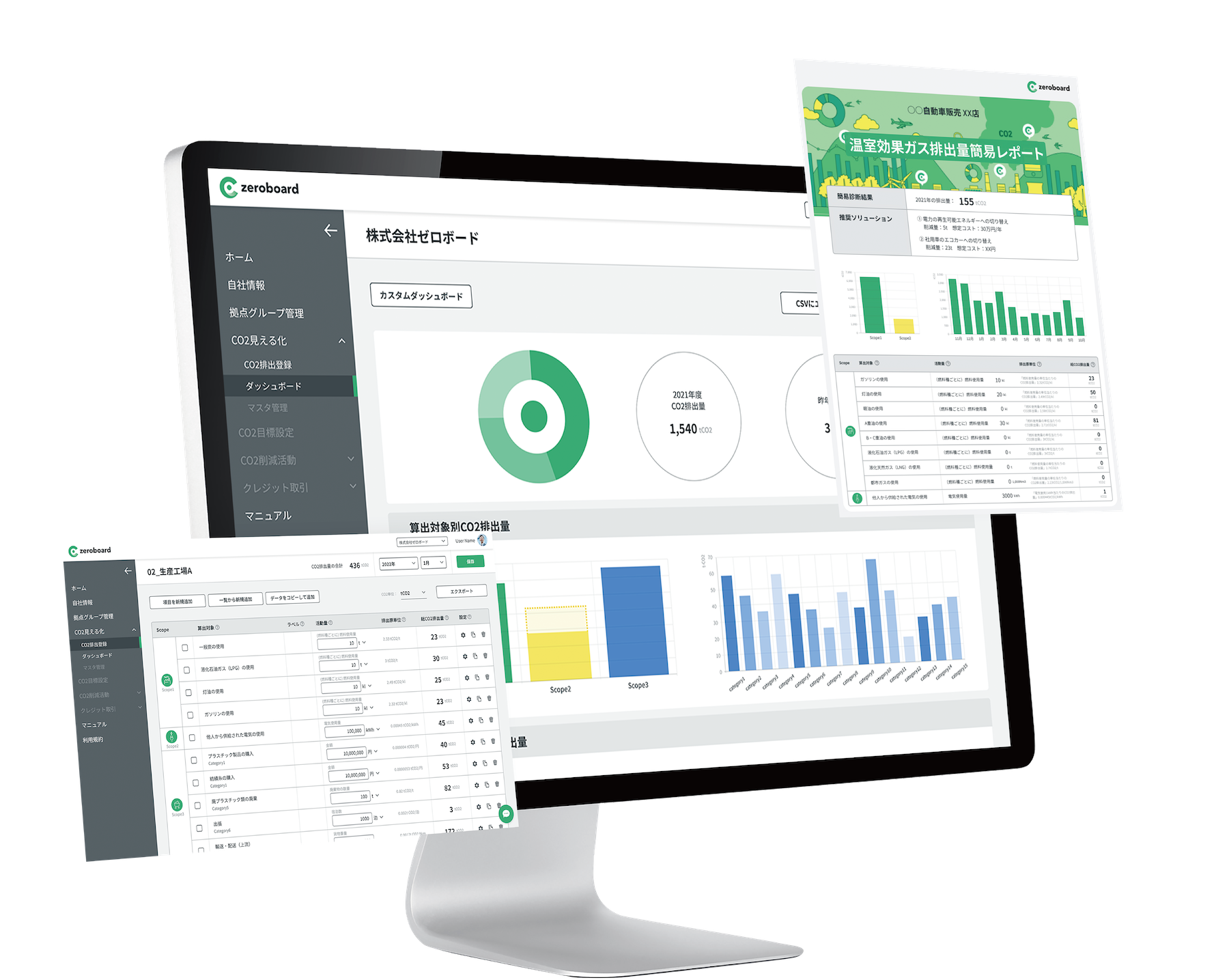 「zeroboard」は、GHG排出量算定・開示・削減までを支援するソリューションです。国内外のサプライチェーン排出量、製品別・サービス別の排出量(カーボンフットプリント:CFP)をクラウドで算定・可視化するほか、削減貢献量や水資源などの登録も可能で、各種レポートの出力にも対応。算定を入り口として、ユーザー企業の課題に合わせたGHG削減ソリューションを提供することで、企業の脱炭素経営を支援しています。
