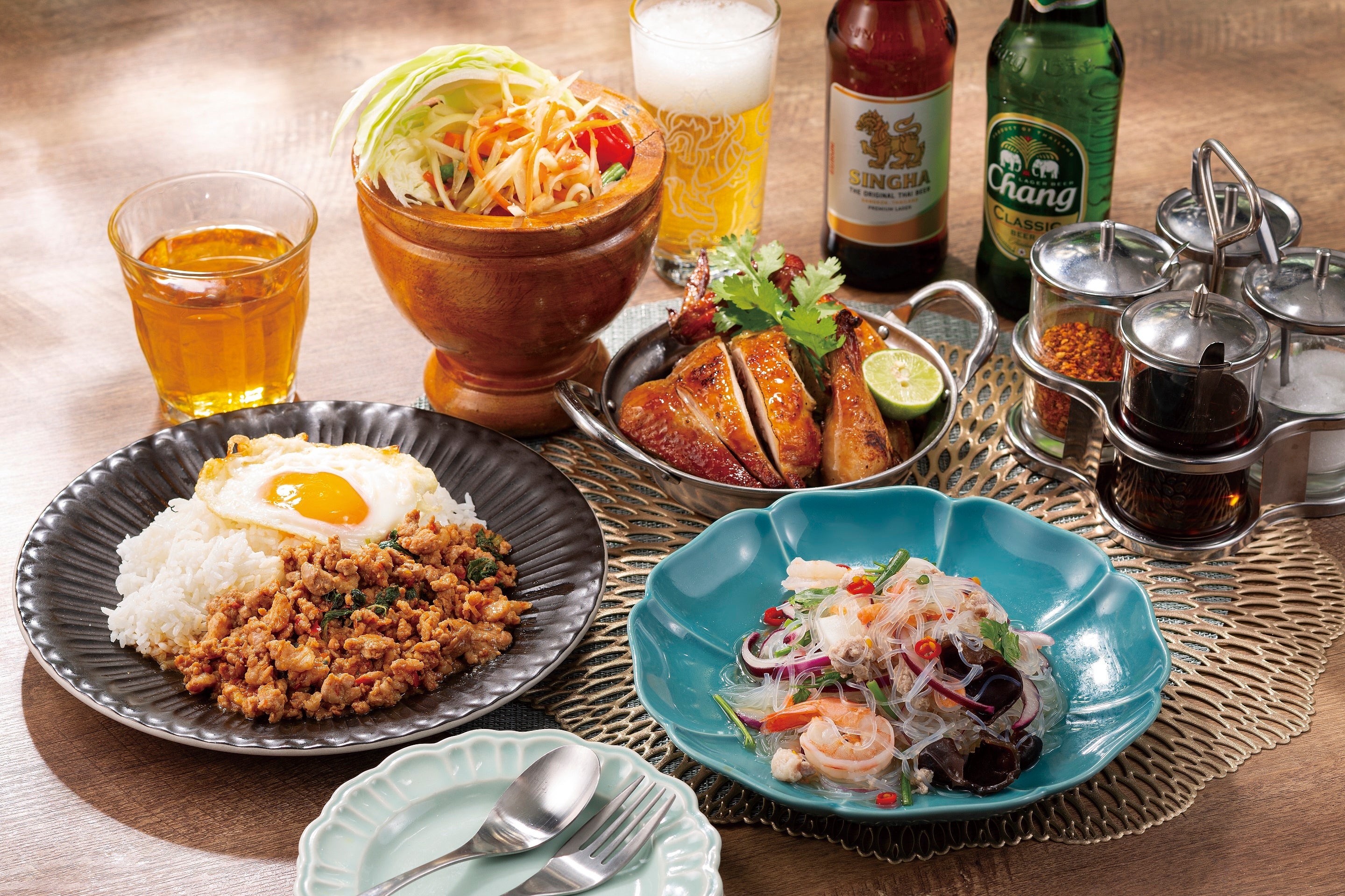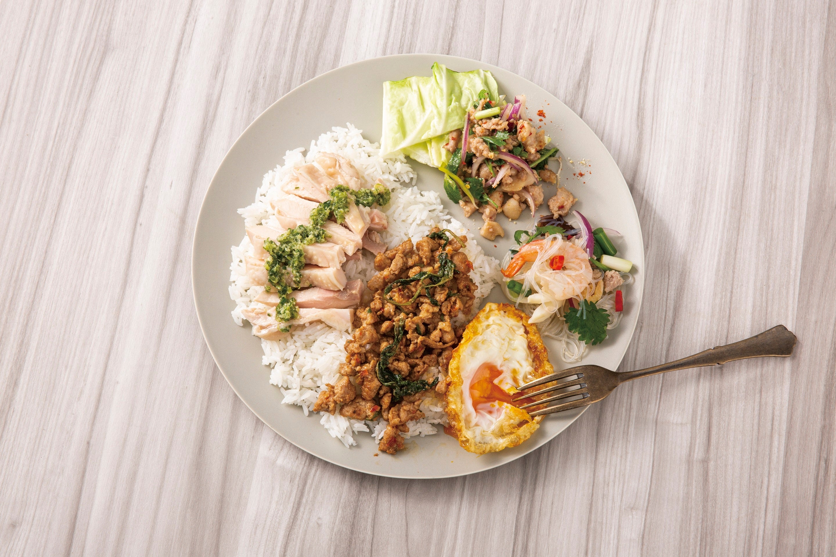 ※写真は、豚のガパオ、茹で鶏のジンジャーソースがけ、豚挽き肉のスパイシーハーブ和え、シーフードと春雨のスパイシーサラダ