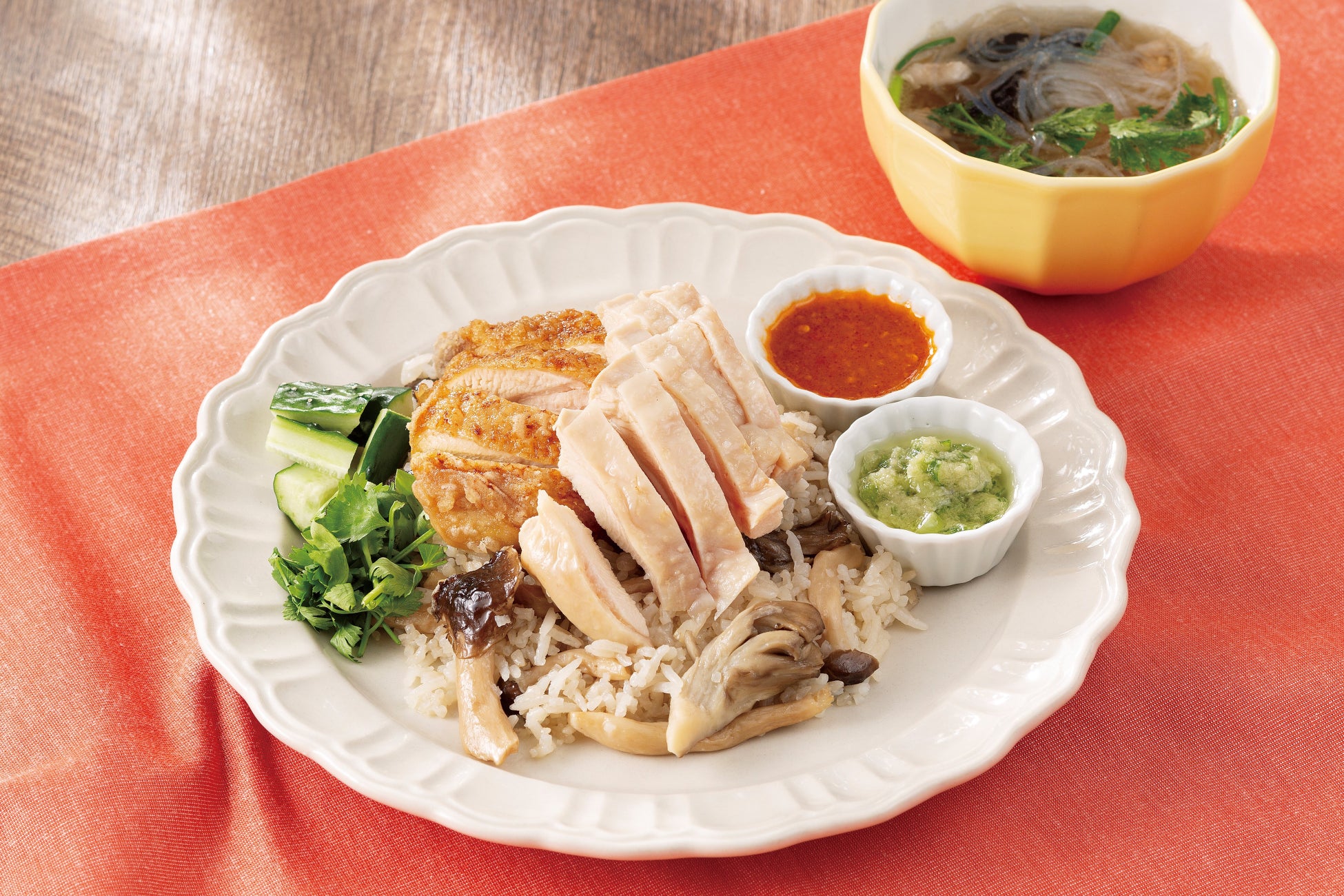 たっぷりのしめじ、エリンギ、舞茸を炊き込んだキノコ香るジャスミンライスに、柔らかいタイ産「米どり」のしっとりした茹で鶏とサクッとした揚げ鶏をのせた、秋限定の進化系カオマンガイ。