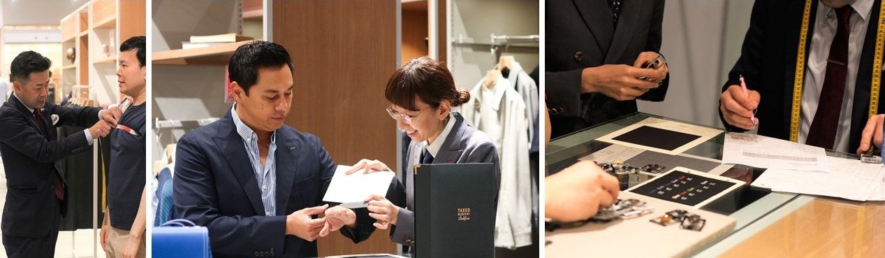 現地の富裕層を中心にファンを広げてきた「タケオキクチ」では、より自分の体型にフィットし素材や裏地等が選べるオーダースーツのニーズが高まりを見せております。 今回は日本から2 名の販売スペシャリストが現地に出向き、アポイント形式で採寸とオーダーを行いブランドの魅力と品質を伝える日本と同様のサービスを提供し、現地顧客から高い評価をいただきました。今回の取り組みで現地スタッフへの技術の継承も行うことで、更なるグローバル展開を見据え本イベントを定期的な活動にしていきます。