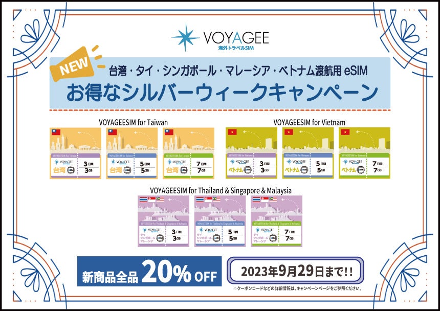 2023年8月30日~9月29日までの期間中、「VOYAGEESIM for Taiwan」「VOYAGEESIM for Thailand & Singapore & Malaysia」「VOYAGEESIM for Vietnam」の初回購入時に限り、以下のクーポンコードを入力すると20%割引で購入できます。ぜひ、この機会にお得な「VOYAGEESIM」をご利用ください。