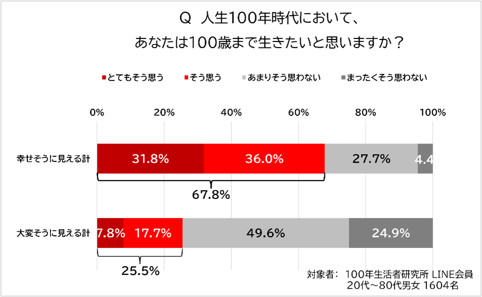 その結果、「とてもそう思う」もしくは「そう思う」と答えたのは「100歳の人は幸せそうに見える」人が67.8%だったのに対し、「大変そうに見える」人では25.5%となり、40ポイント以上の差がありました。