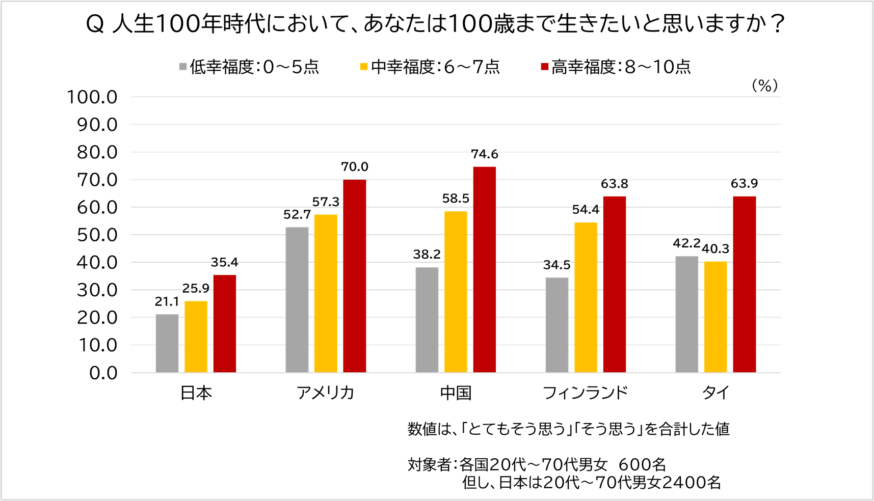 幸福度スコアを「高幸福度(8~10点)」「中幸福度(6~7点)」「低幸福度(0~5点)」で分け、それぞれで「100歳まで生きたい」人の割合をみました。その結果、幸福度が高い順に「とてもそう思う」「そう思う」の割合が多くなり、日本では高幸福度(35.5%)が低幸福度(21.1%)と比べて約1.7倍高くなりました。