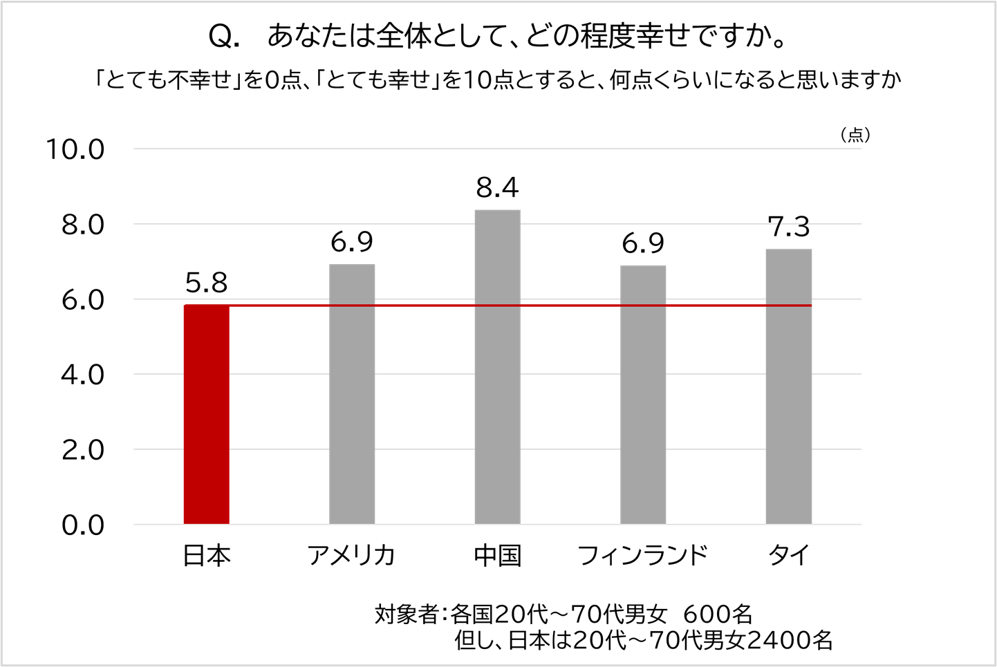 10点満点で幸福度を質問したところ、日本の平均点は5.8点で対象5か国の中で最も低い結果となりました。一方、最も高かったのは中国の8.4点で、タイ(7.3点)、アメリカとフィンランド(どちらも6.9点)と続きました。