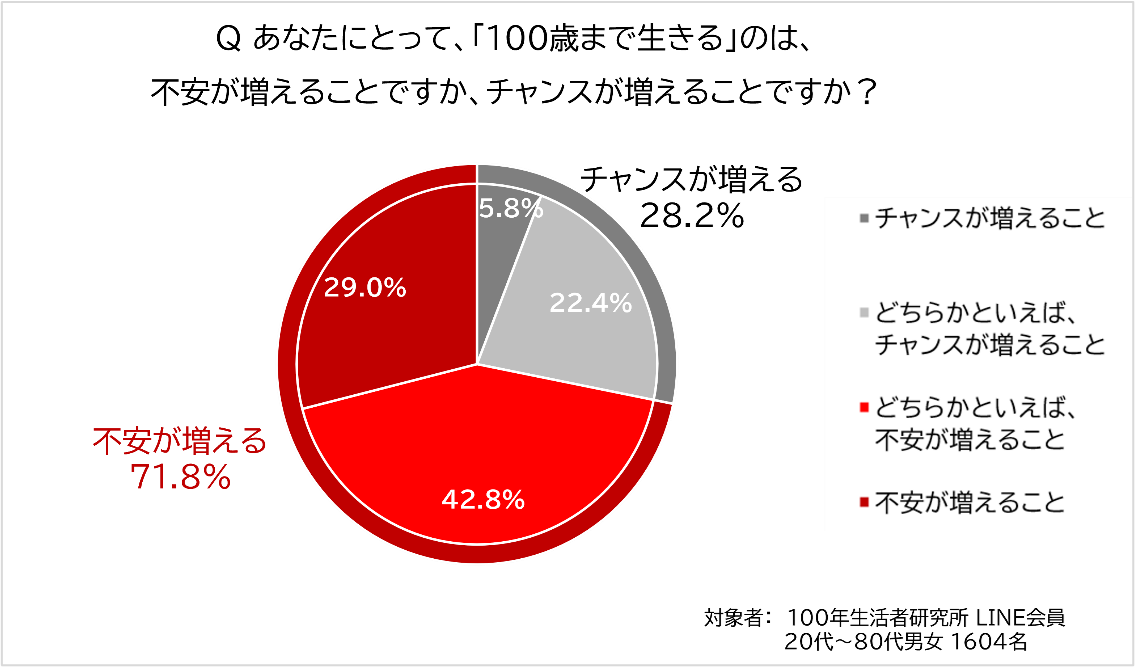 当研究所では国内の会員を対象に毎週アンケートを実施しています。そのアンケートで「100歳まで生きることは不安が増えることですか、チャンスが増えることですか」と質問したところ、「不安が増える」と回答したのが71.8%に上り、多くの人が「長生きはリスク」と捉えていることが分かりました。