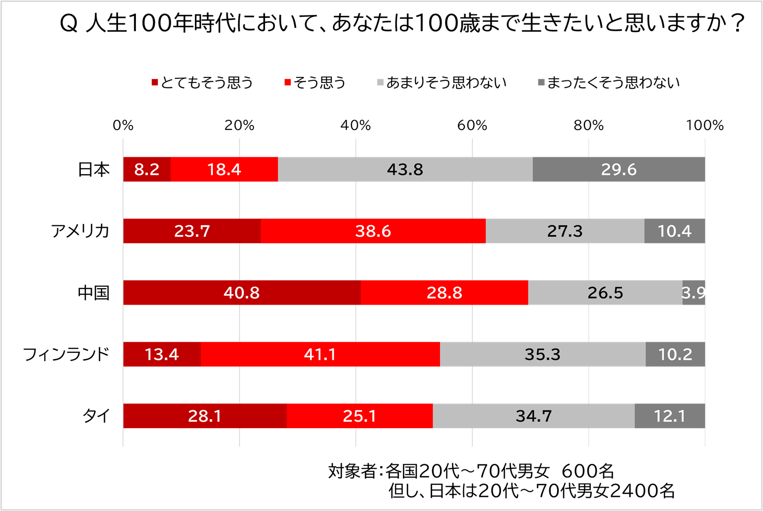 100歳まで生きたいかを聞いたところ、「とてもそう思う」もしくは「そう思う」と答えた割合は、日本が26.6%で対象5か国の中で最も低く、2番目に低いタイ(53.2%)と比較しても半数以下でした。最も高かったのは中国の69.6%で、次いでアメリカ(62.3%)、フィンランド(54.5%)と続きました。