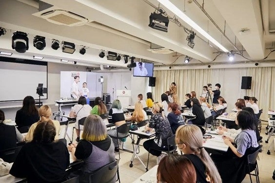 韓国美容に興味がある学生が目を輝かせながら熱心に授業を受けている様子。韓国で実際に活動するメイクアップアーティストの授業を聞ける貴重な機会に学生からの質問が止まらず、本来予定していた時間より大幅に押してしまうほど。
