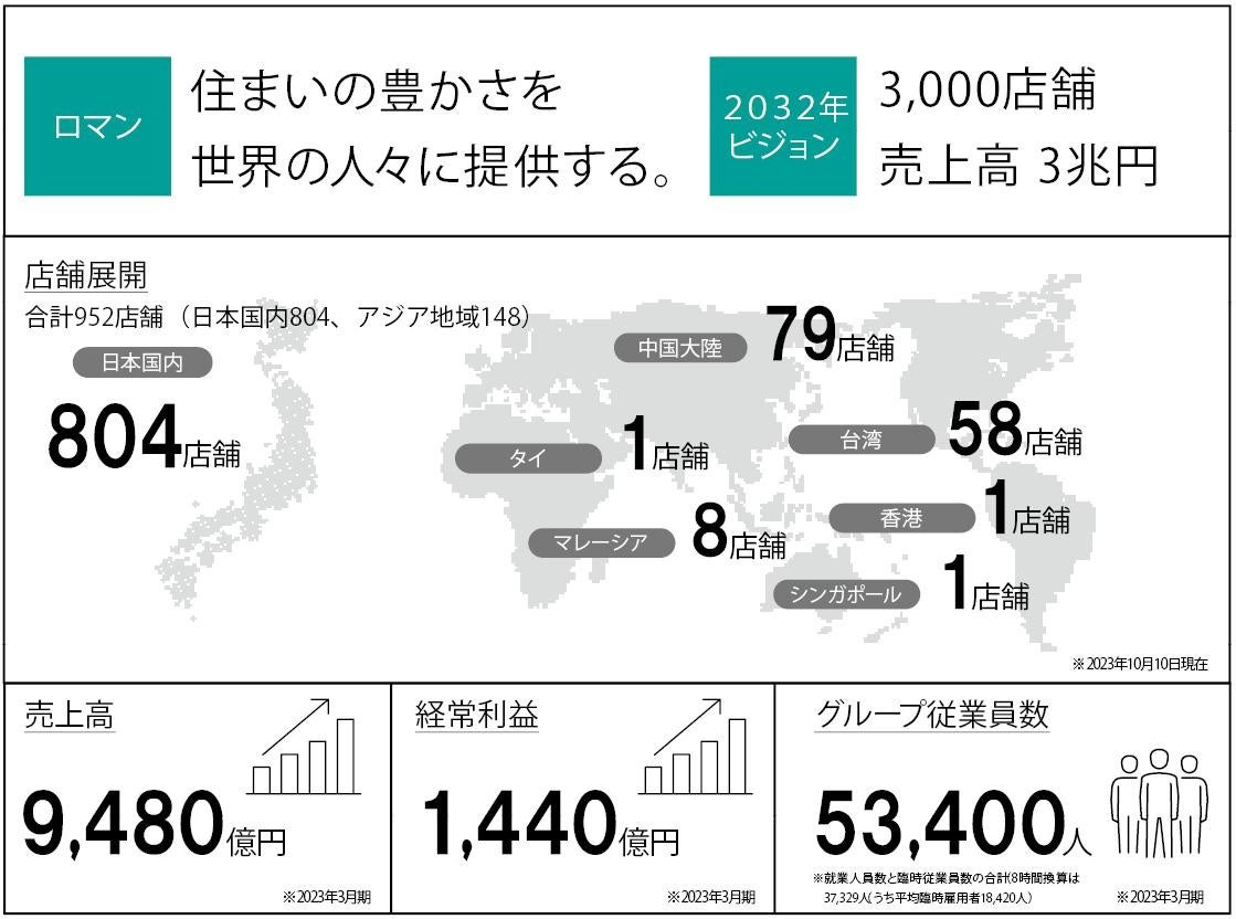 ニトリグループは、「住まいの豊かさを世界の⼈々に提供する。」というロマン(志)、2032 年3,000 店舗、売上⾼3 兆円を達成するというビジョンを掲げ、住まいに関わる家具、ホームファッション関連商品を取り扱う「ニトリ」、⽣活必需品を中⼼に⼈気の⾼いホームファッション商品を取り扱う「デコホーム」、エクステリア商品も取り扱うホームセンター「島忠」、⼤⼈の⼥性向けアパレルブランドを取り扱う「N プラス」等を展開するグループです。