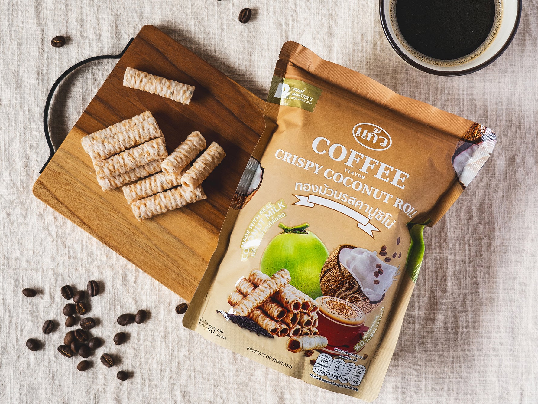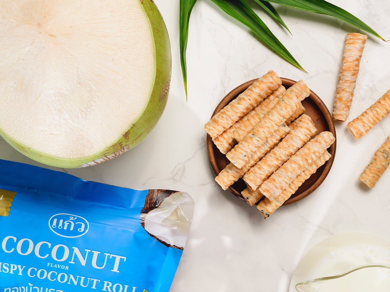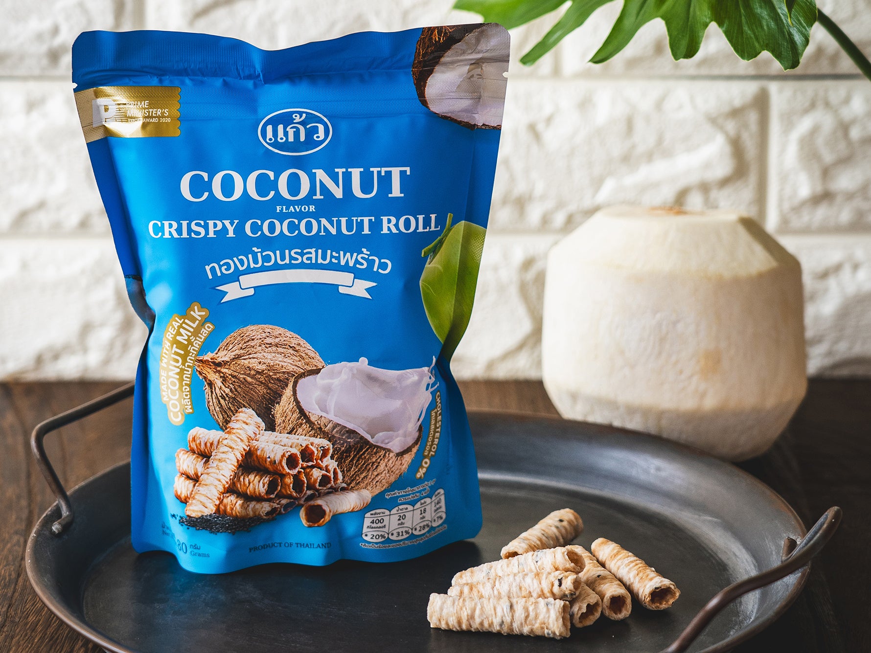 タイ発ローカルスナックブランド〈ゲーオ(Kaew)〉から発売されるのは、搾りたてのココナッツミルクを使用し、ロール状に巻いたサクサクのココナッツスナック。ホームメイドのようなシンプルな原材料で構成されるクリスピーココナッツロールは、ミネラル豊富な土壌で採れるココナッツを使用。厳選された原材料をフレッシュな状態で使用することで、ココナッツ本来の雑味のない美味しさが包み込まれています。