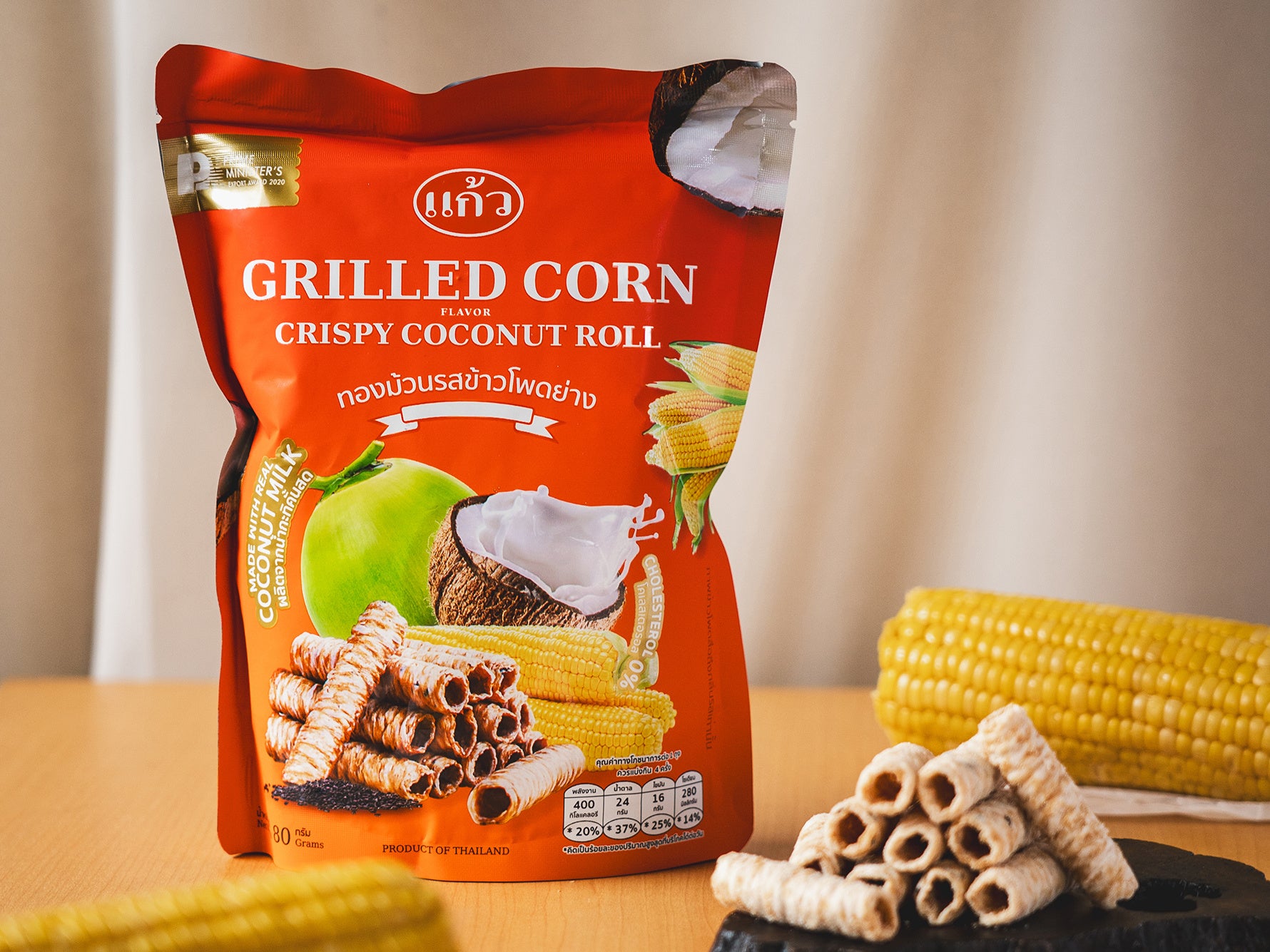 説明:ロール状にさくっとふんわり焼き上げたココナッツスナックを、グリルドコーンをイメージしたほんのりソルティなフレーバーで。ココナッツミルクを製造工程で搾り、すぐに生地に練り込むことで、海に近いミネラル豊富な土壌で育ったココナッツ本来の甘さと香りが包み込まれています。