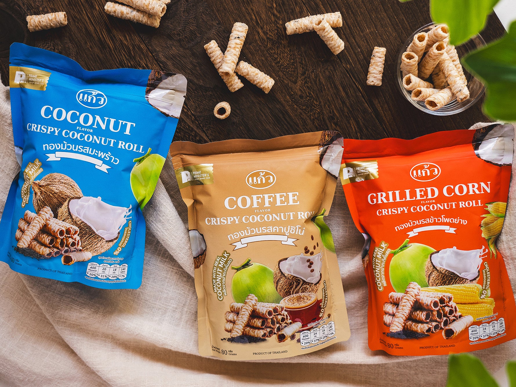 タイ発 ローカルスナックブランド ゲーオ(Kaew)より〈クリスピーココナッツロール〉3種が新登場。