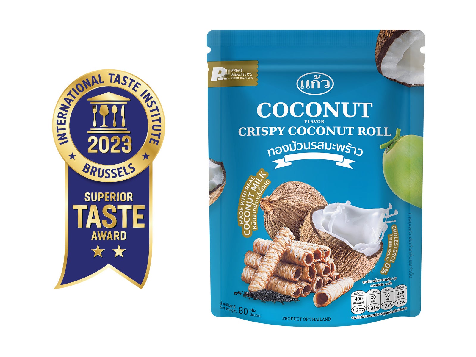 ベルギー・ブリュッセルに本部を置く国際味覚審査機構 International Taste Institute(旧iTQi)によって開催されるSuperior Taste Award 2023において、ゲーオ(Kaew)のクリスピーココナッツロールは2ツ星を獲得しています。ミシュランガイドやゴ・エ・ミヨなどに代表されるヨーロッパで最も著名な飲食関連協会所属の200人以上のシェフとソムリエで構成された世界有数の味覚の専門家集団により、第一印象、外観、香り、味、食感(食品)または後味(飲料品)の5つの国際官能分析基準(AFNOR XP V09A)に基づく体系的なアプローチに沿って評価され、「2ツ星」を獲得しました。