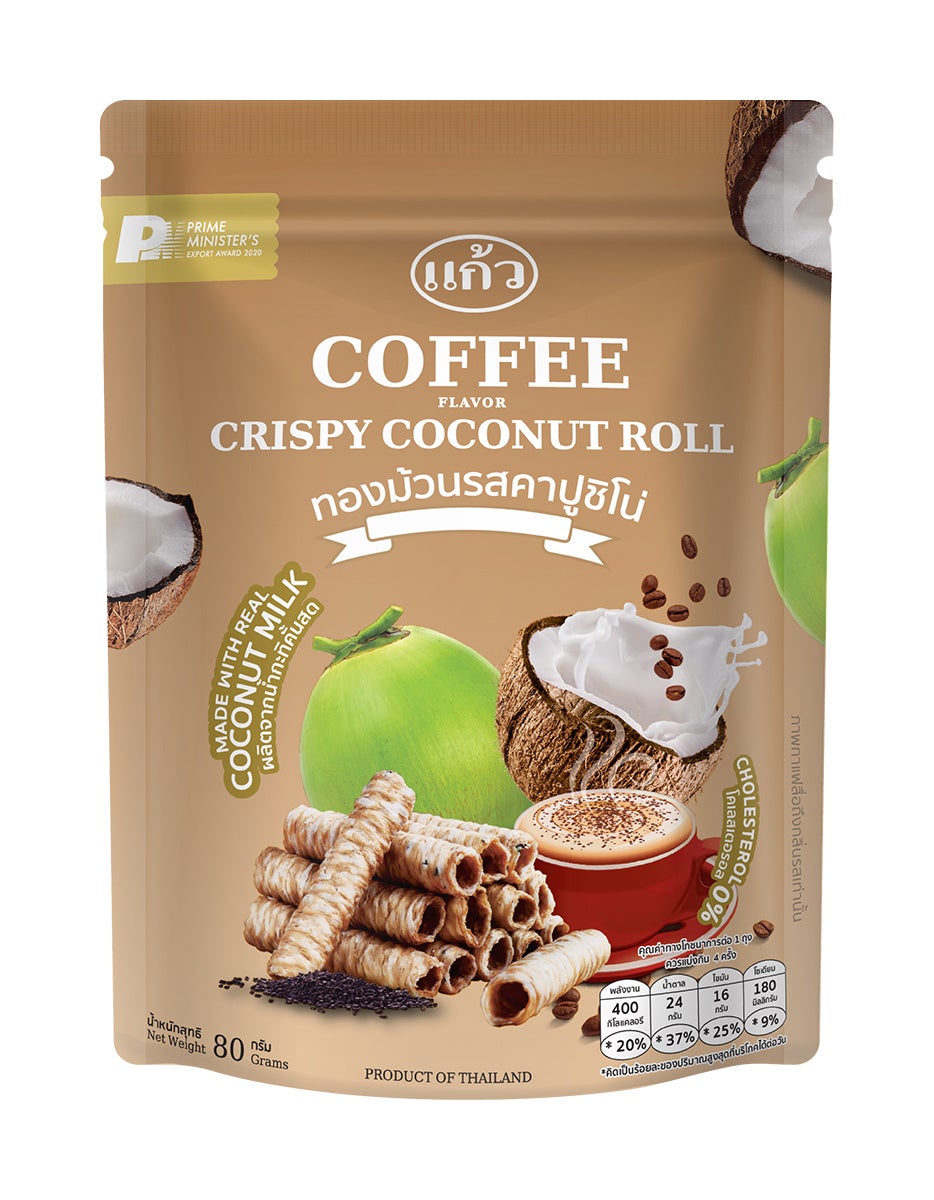 ゲーオ(Kaew)はタイ西部の観光地、カンチャナブリーにてオリジナルレシピで作った地域の銘菓を取り扱うスーベニアショップからはじまったスナックブランド。ゲーオ(Kaew)がつくるクリスピーココナッツロールは、Thong muan(トーンムアン)と呼ばれるカンチャナブリーの伝統菓子です。トーン=ゴールド、ムアン=巻く という意味のあるトーンムアンは富を呼び込む縁起物としてタイでは定番のスナック。タイの伝統菓子を世界に届けるゲーオ(Kaew)が作るクリスピーココナッツロールは、ココナッツが苦手な方でも美味しく感じるバランスの良い甘さと風味。焼きたてのお菓子のような香ばしいサクサクのローカルスナックの味わいをぜひお試しください。