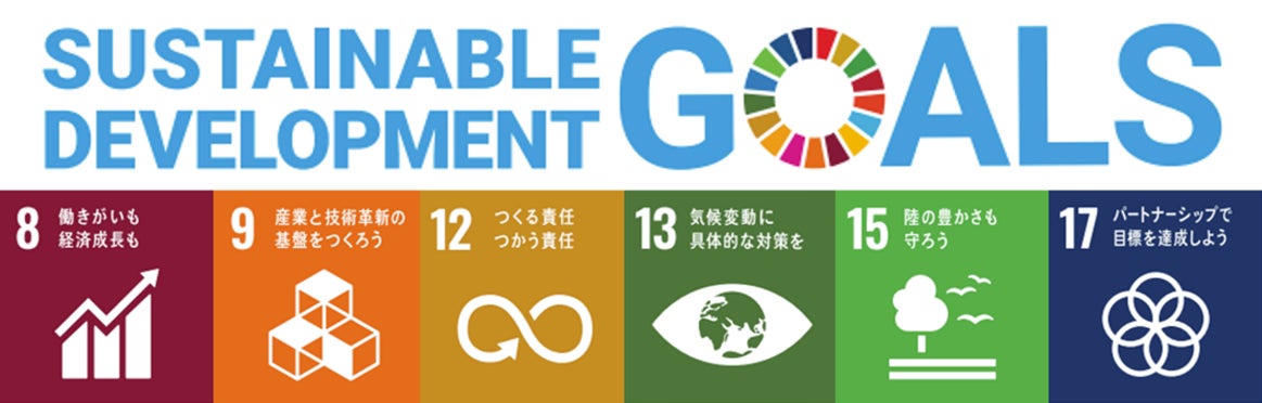SDGsへの取組み:弊社サービスは主に8,9,12,13,15,17のテーマについての取り組みを推進しています。