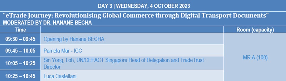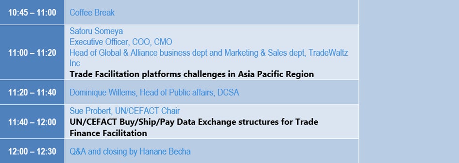 UN/CEFACT議長のSue、副議長のHanane、ICC DSI常務のPamela、シンガポール政府からTradeTrustを提案するSin Yong、コンテナ船社を束ねDCSAのDominiqueといった豪華メンバーにトレードワルツが加わり、貿易手続きの手法を書類からデータへ変え、商流・物流・金流のデータを一気通貫で活用できるように何ができるかを討議しました。(冒頭の写真はこのパネルの様子)