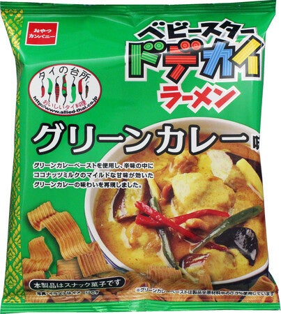 「ベビースタードデカイラーメン(タイの台所 グリーンカレー味)」は、グリーンカレーペーストを使用し、辛味の中にココナッツミルクのマイルドな甘みがきいたグリーンカレーの味わいを表現。口に入れた瞬間から広がる辛さと、麺を噛むほどに感じられるココナッツミルクの甘みが複雑に調和し、本場タイの味わいを存分に堪能できます。