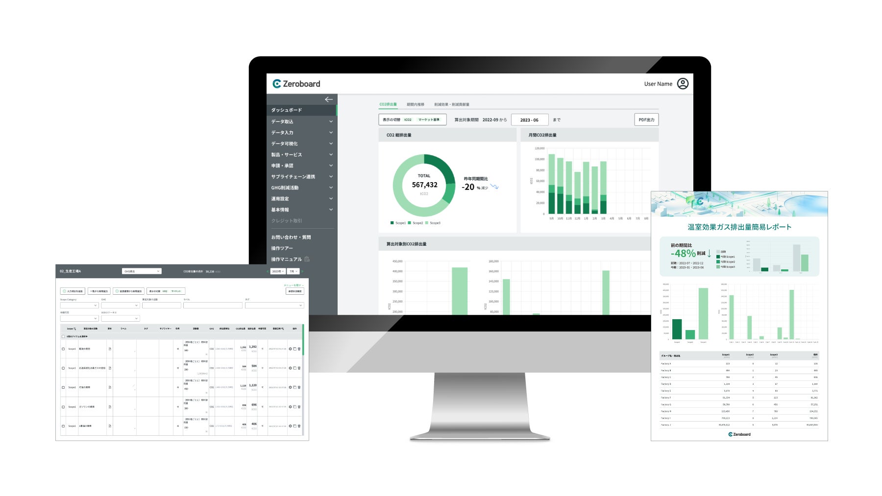 「Zeroboard」は、GHG(温室効果ガス)排出量算定・開示・削減までを支援するソリューションです。国内外のサプライチェーン排出量、製品別・サービス別の排出量(カーボンフットプリント:CFP)をクラウドで算定・可視化するほか、削減貢献量や水資源などの登録も可能で、各種レポートの出力にも対応。算定を入り口として、ユーザー企業の課題に合わせたGHG削減ソリューションを提供することで、企業の脱炭素経営を支援しています。