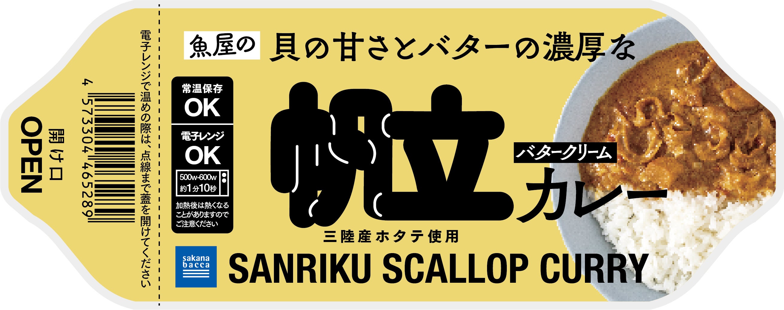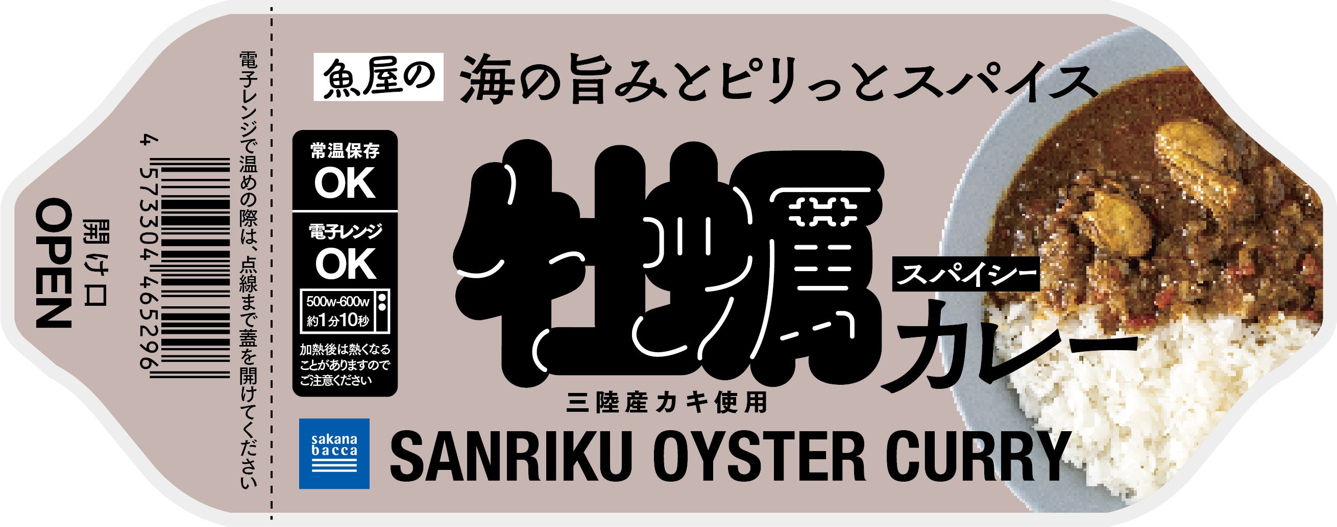 「魚屋のカレー」は、電子レンジで温めるだけで食べられるシーフードカレーです。魚の味をしっかりと味わっていただくために大き目にカットした魚介類を使用しています。サバ、ホタテ、カキは全て三陸産の原料を使用し、素材の味を活かした味わいに仕上げた商品です。本商品は宮城県牡鹿郡女川町の水産加工品メーカー:鮮冷の「みなとまちカレー」の商品へのこだわりに共感し、sakana baccaのブランディングに合わせてリパッケージングした商品です。