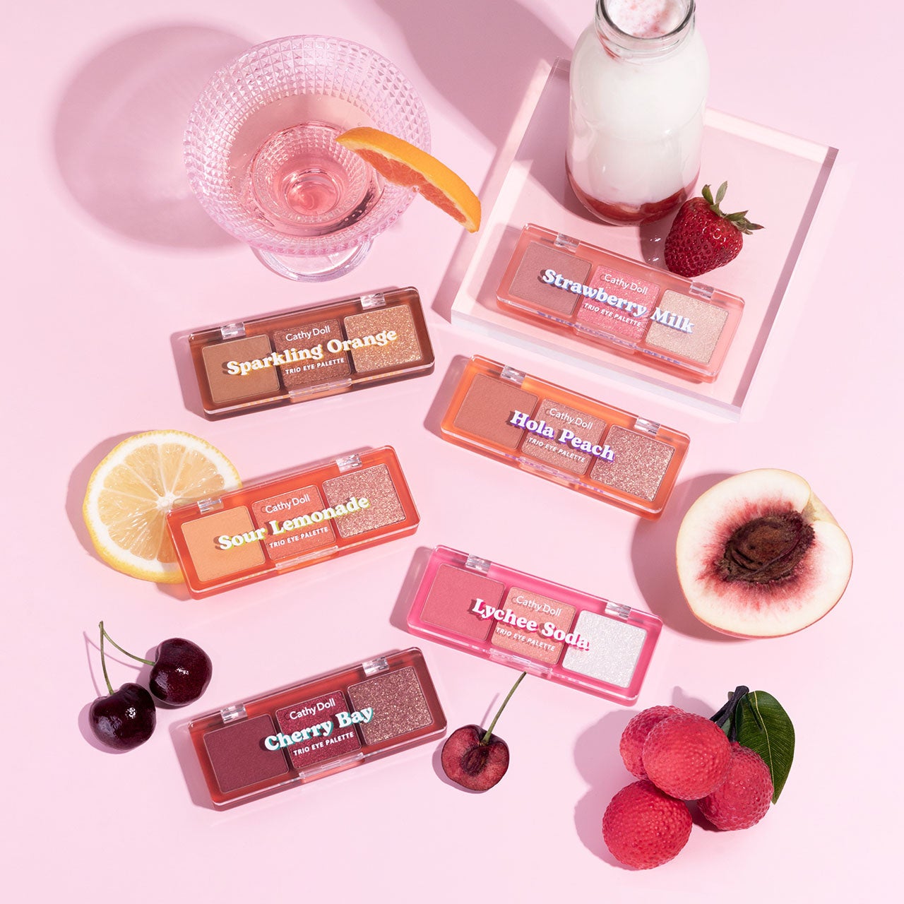6種のフルーツジュースカラーから選ぶ、マット・シマー・グリッター3質感入りトリオパレット。