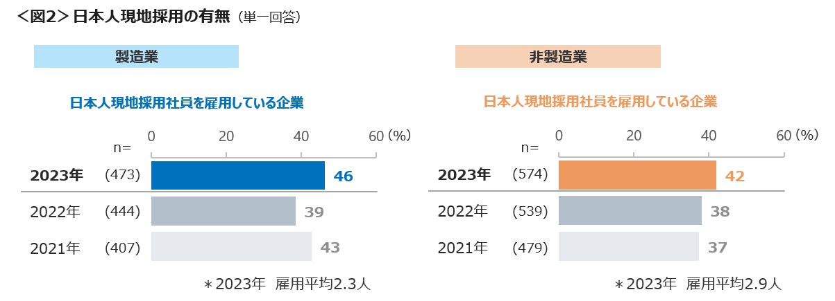 日本人現地採用社員を雇用している企業は、製造業で46%、非製造業で42%であり、製造業、非製造業ともに昨年より増加。平均雇用人数は製造業で2.3人、非製造業は、2.9人である。<図2>