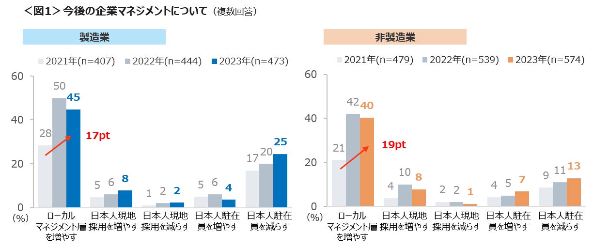 今後の企業マネジメントでは、製造業の45%、非製造業の40%が「ローカルマネジメント層を増やす」と回答。コロナ禍であった2021年と比較すると、製造業は17pt増加、非製造業も19pt増加と、増加幅が大きい。製造業、非製造業ともに「日本人駐在員を減らす」が増加傾向にある。このことから企業マネジメントの現地化が進むと見られる。 <図1>