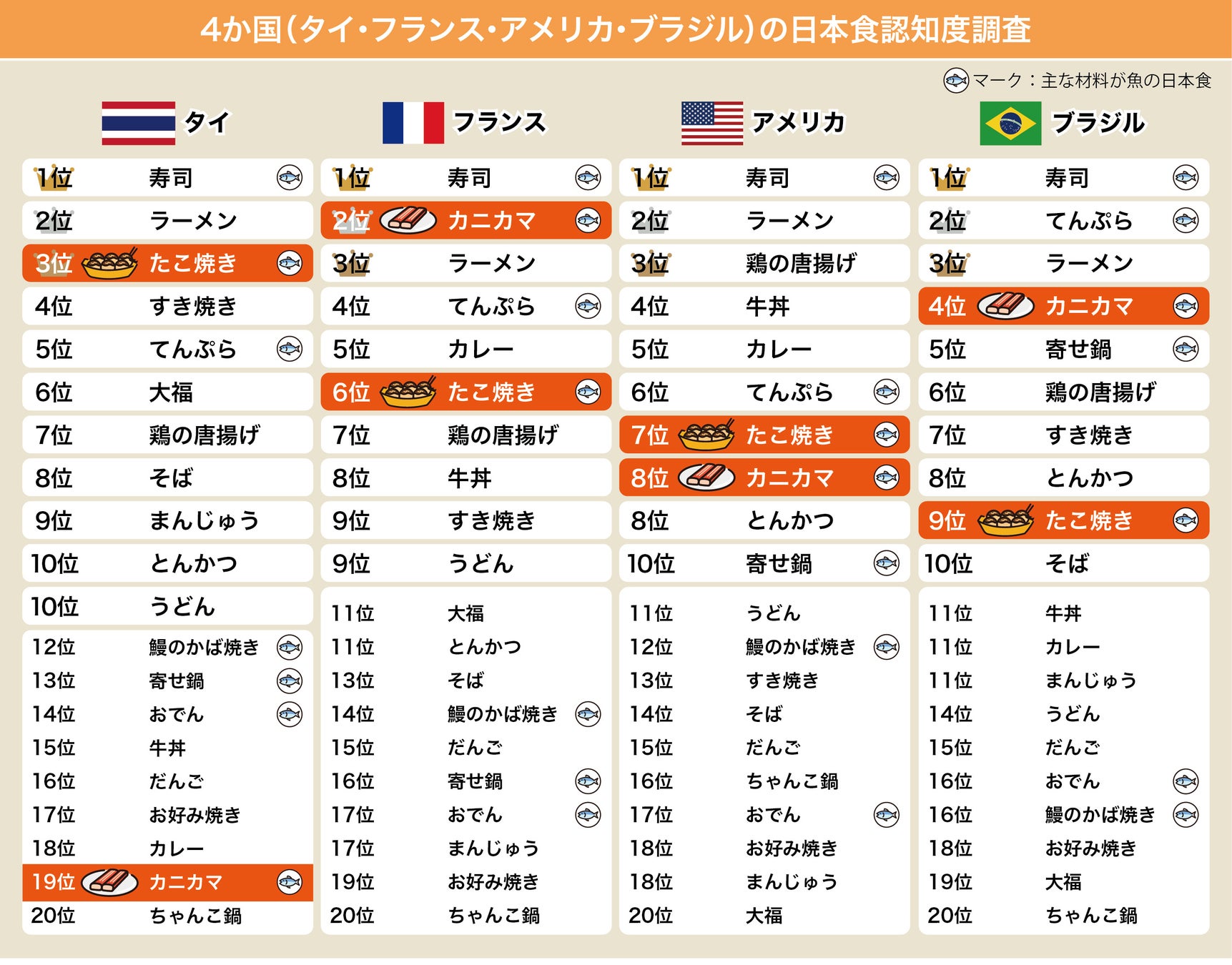 フランス・アメリカ・ブラジルのランキングでは、1970年代に日本で商品化された「カニカマ」が、江戸期のファストフードとして古典落語の題材としても取り上げられる「そば」や、1963年に全米1位のヒットを記録した坂本九さんの楽曲『上を向いて歩こう(英語タイトル=sukiyaki)』にもある「すき焼き」を抑えた結果となりました。