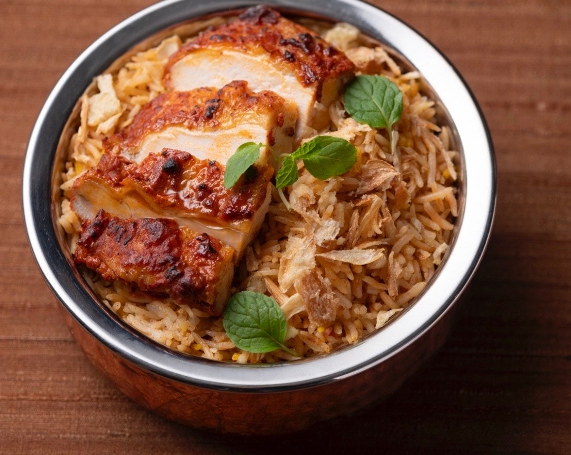 バスマティ米を10種類以上のスパイスで炊き込んだビリヤニと、スパイスマリネの鶏もも肉をオーブンで焼き、柔らかくジューシーに仕上げたシンガポール流にアレンジしたインド料理です。