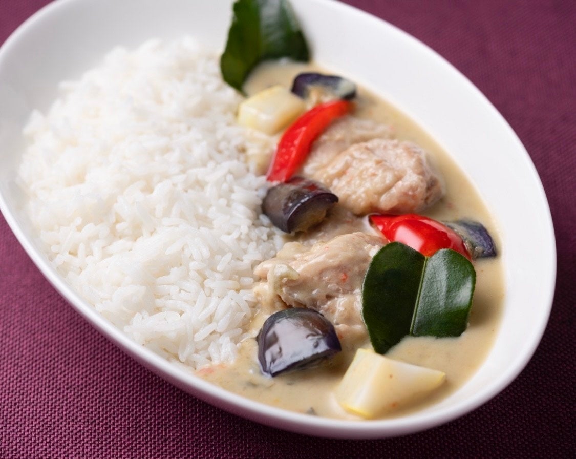 ココナッツミルクと青唐辛子をベースに、タイのスパイスとハーブをふんだんに使用した本格的なカレーです。添えられたバイマックルー(緑の葉)が食欲をそそる香りを演出しています。