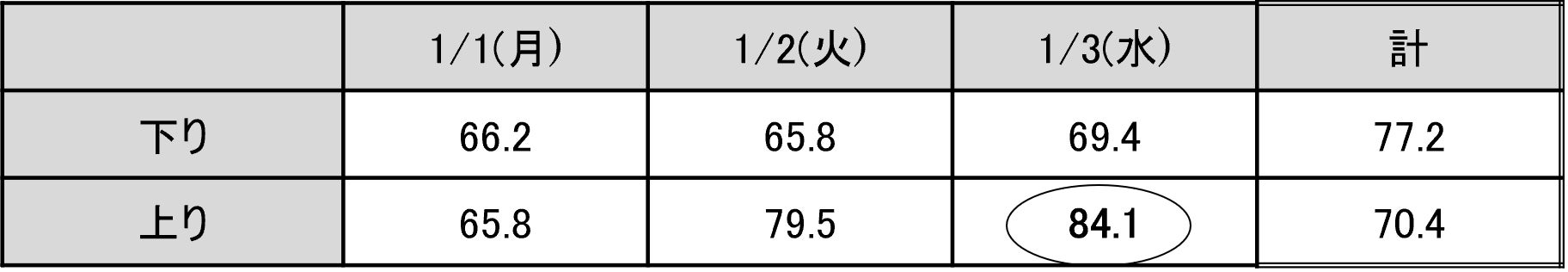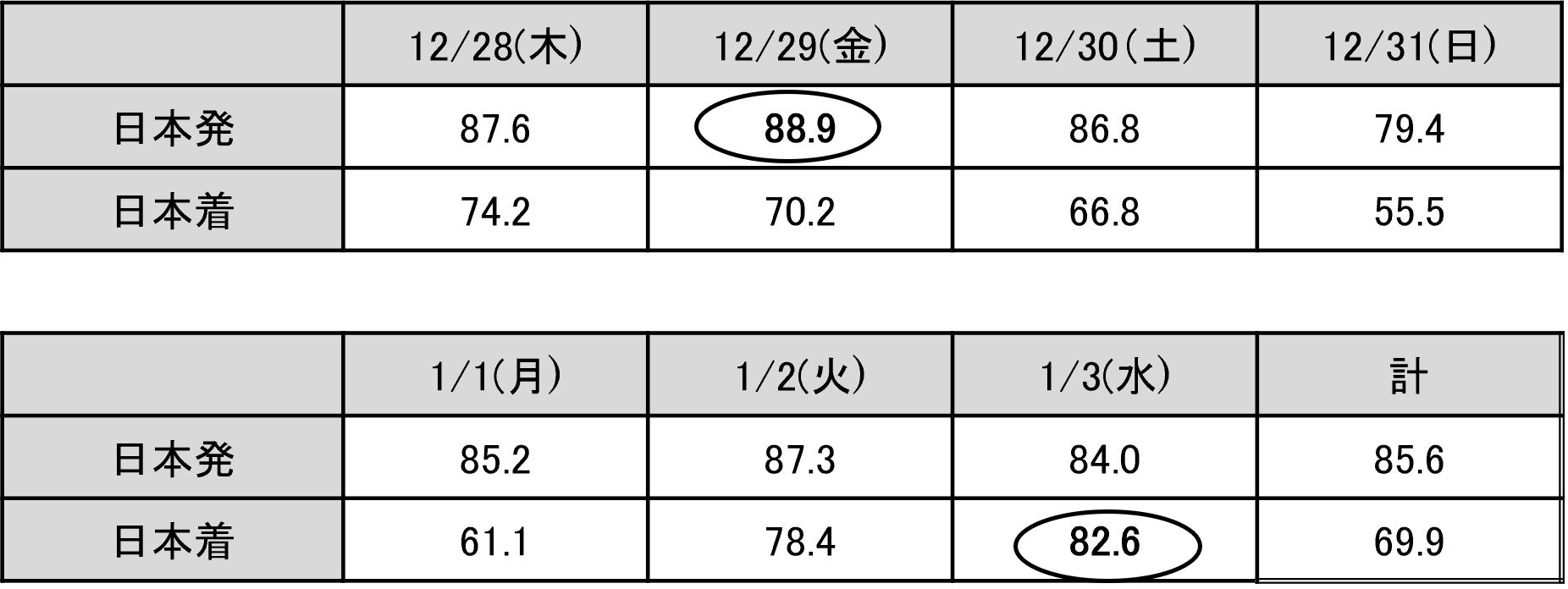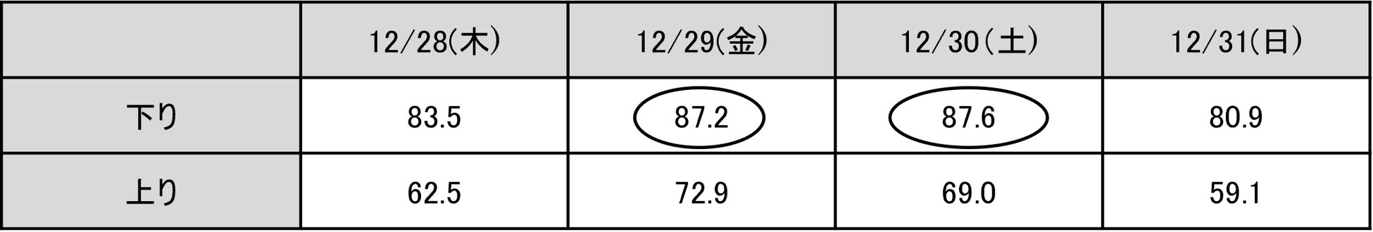◆期間中は、下りが12月29日30日をピークに12月28日から12月31日まで、上りは1月3日をピークに1月2日から3日まで、予約率の高い日が続いています。