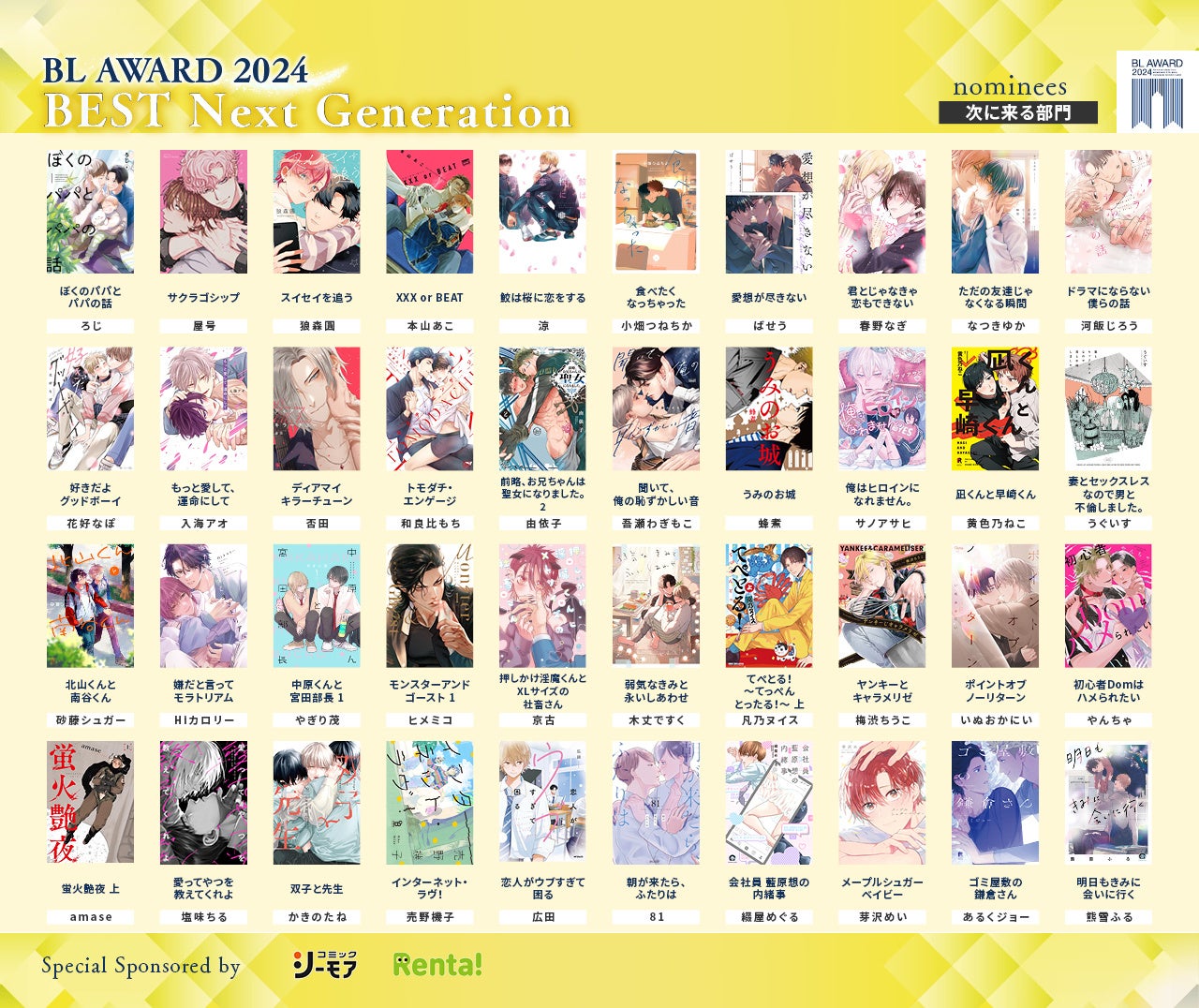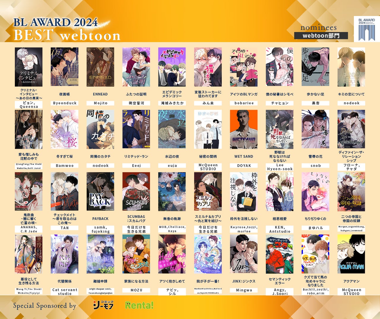 対象作品 (巻末に記載された)発売日が2023年1月1日~2023年12月31日の紙書籍BL関連作品、および2023年1月1日~2023年12月31日に発売した電子書籍BL関連作品。 ※webtoon部門は2023年12月31日までに日本語版が配信されたすべてのwebtoon(縦スクロール形式の)作品が対象。