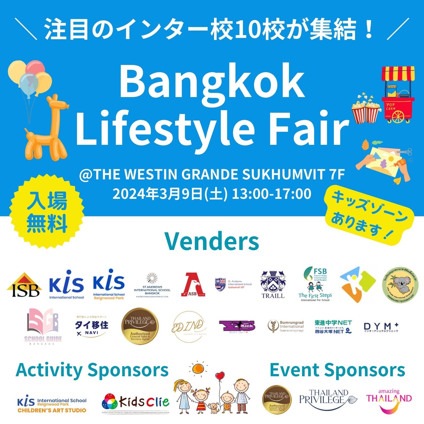 Bangkok Lifestyle Fairは、バンコクのインターナショナルスクール10校とタイ現地でライフスタイル関連のサービスを展開している企業が集まるライフスタイルイベントです。様々なインター校・企業がブースを出展します。キッズアクティビティも充実しておりますので、ぜひご家族でご来場ください。