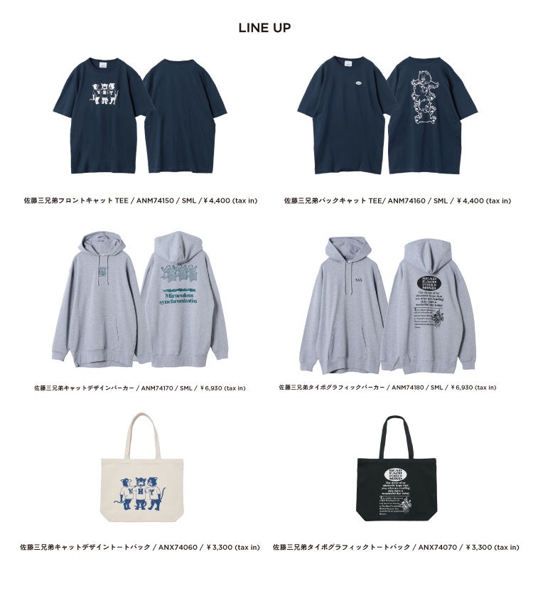 今回は佐藤三兄弟が監修しデザインしたTシャツ、パーカー、トートバックを展開。三兄弟をイメージした3匹の猫のキャラクターや、タイポグラフィックのプリントを施した、ユニセックスで身に着けられるアイテムラインアップです。コラボレーションアイテムをご予約で、オリジナルポストカードをプレゼントいたします。