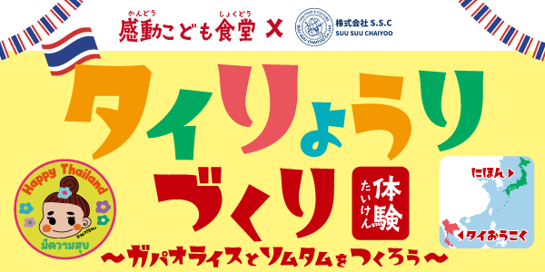 こどもと大人がみんなでタイについて学び、タイの人気料理であるガパオライスやソムタムを作るイベントです。当日は、本格的なタイ料理レストランを多店舗展開する株式会社SUU・SUU・CHAIYOO(スースーチャイヨー)のスタッフが、本場のタイ料理の魅力や調理のコツをレクチャーします。
